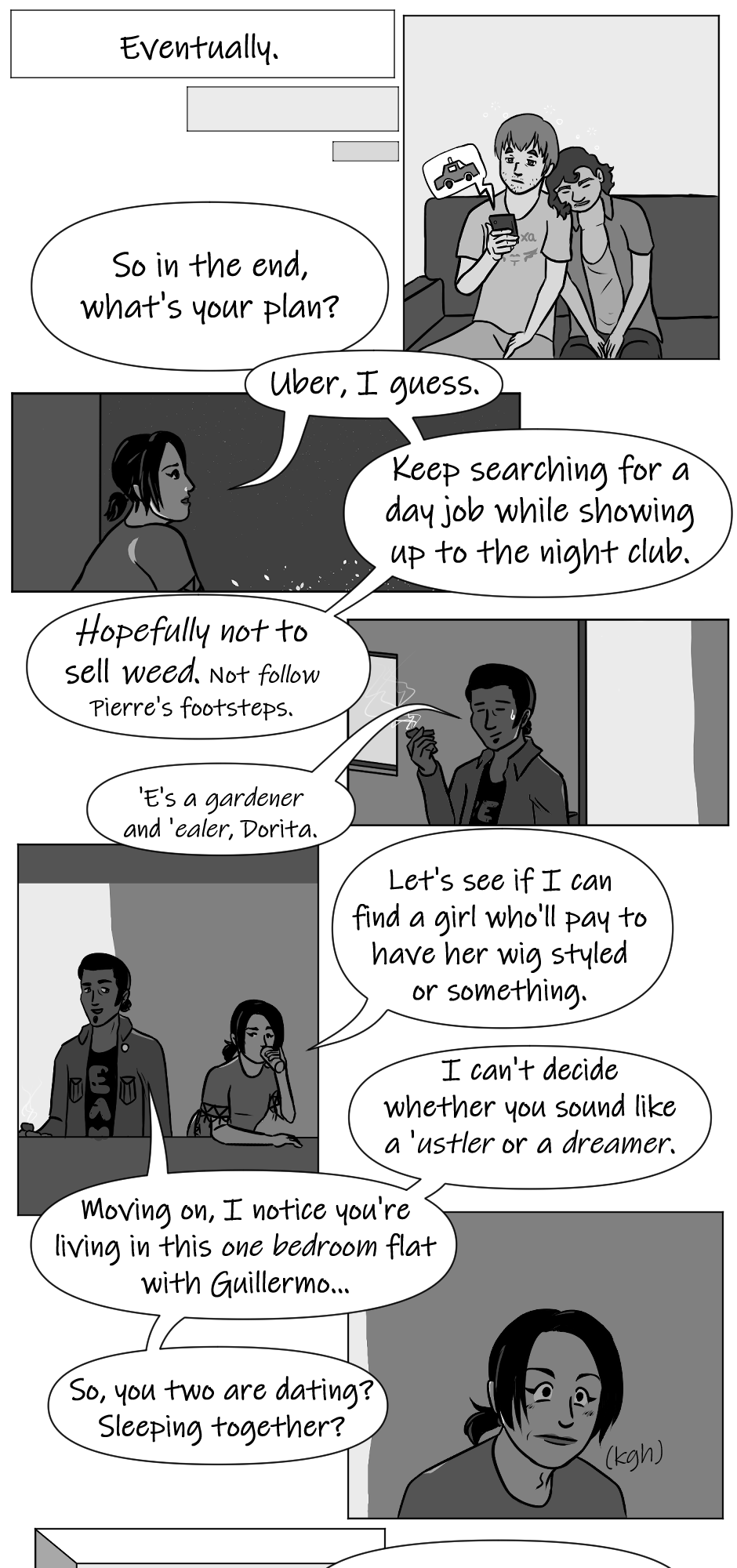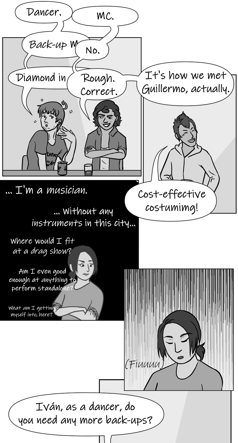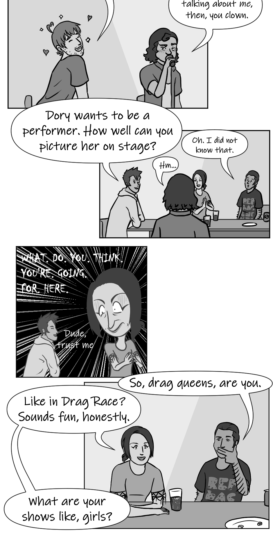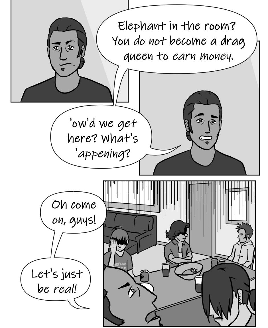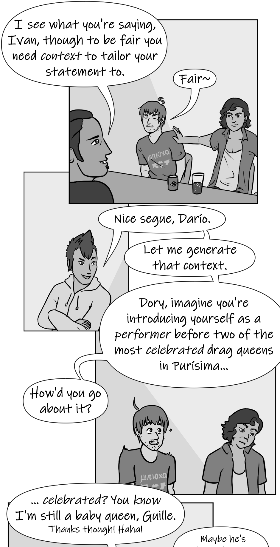 Me in Dory's shoes, I'd be like torn between making fun of Darío for thinking I had a fling with the drag queen costume tailor with a unique fashion sense, and commending him for not making any assumptions about him personally.