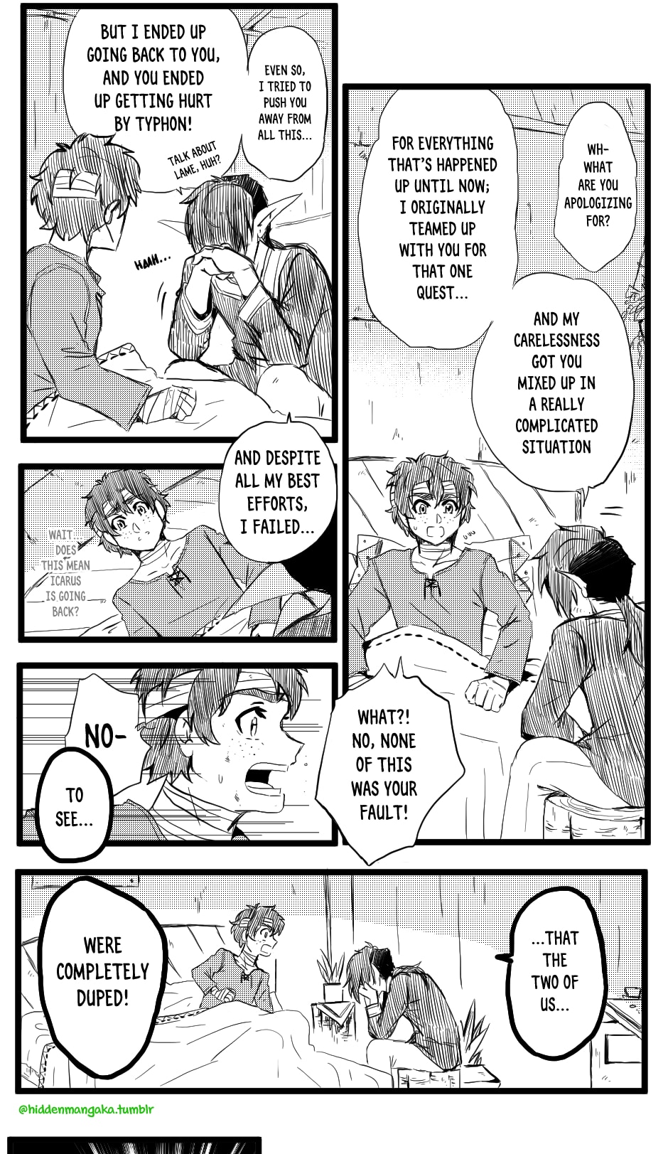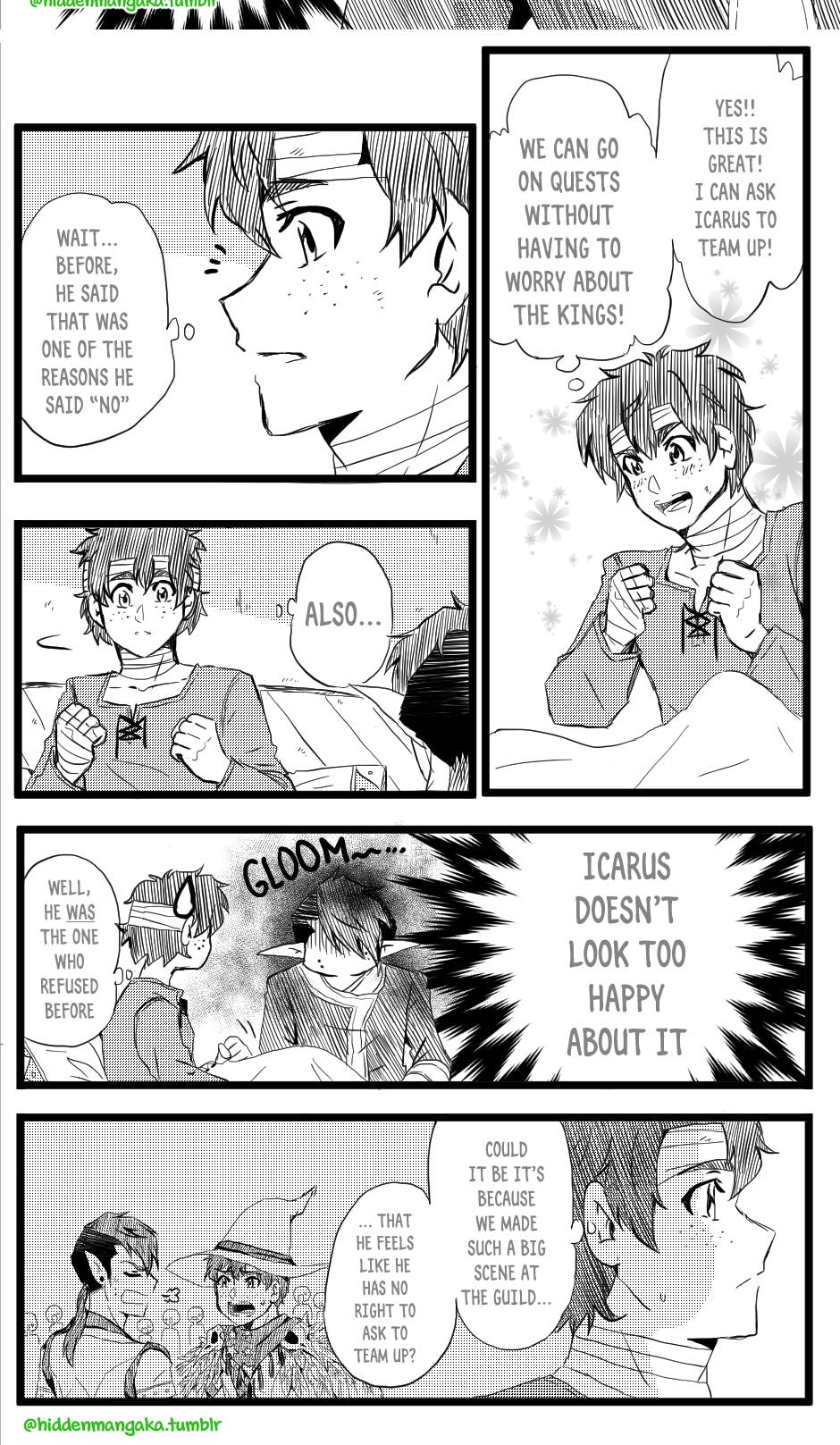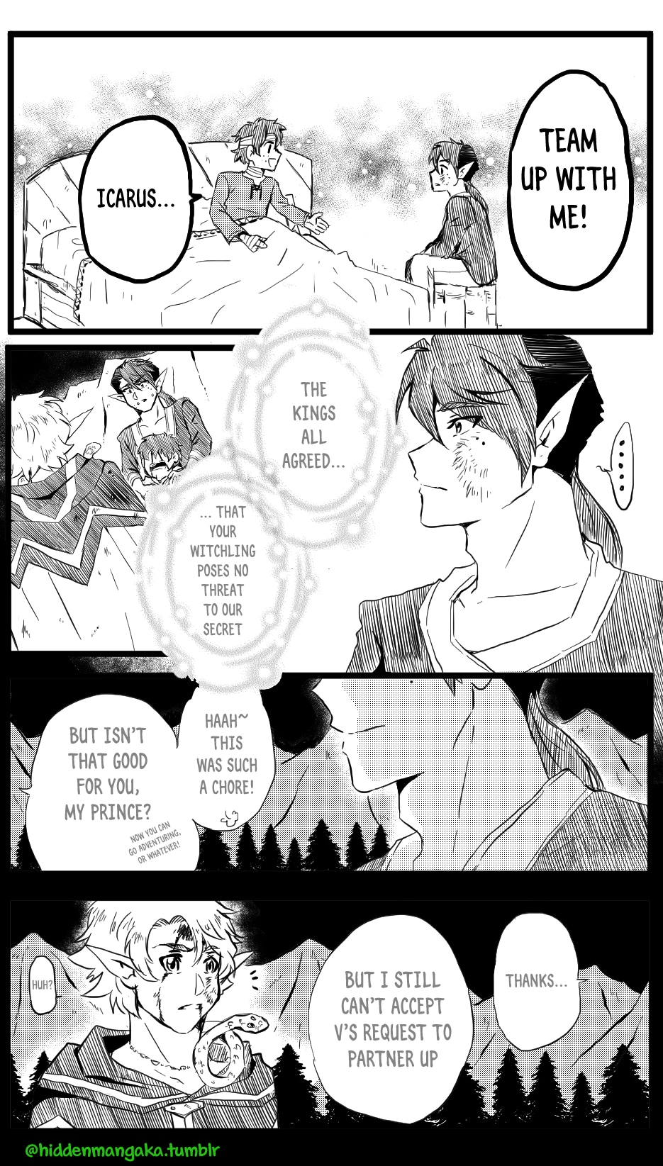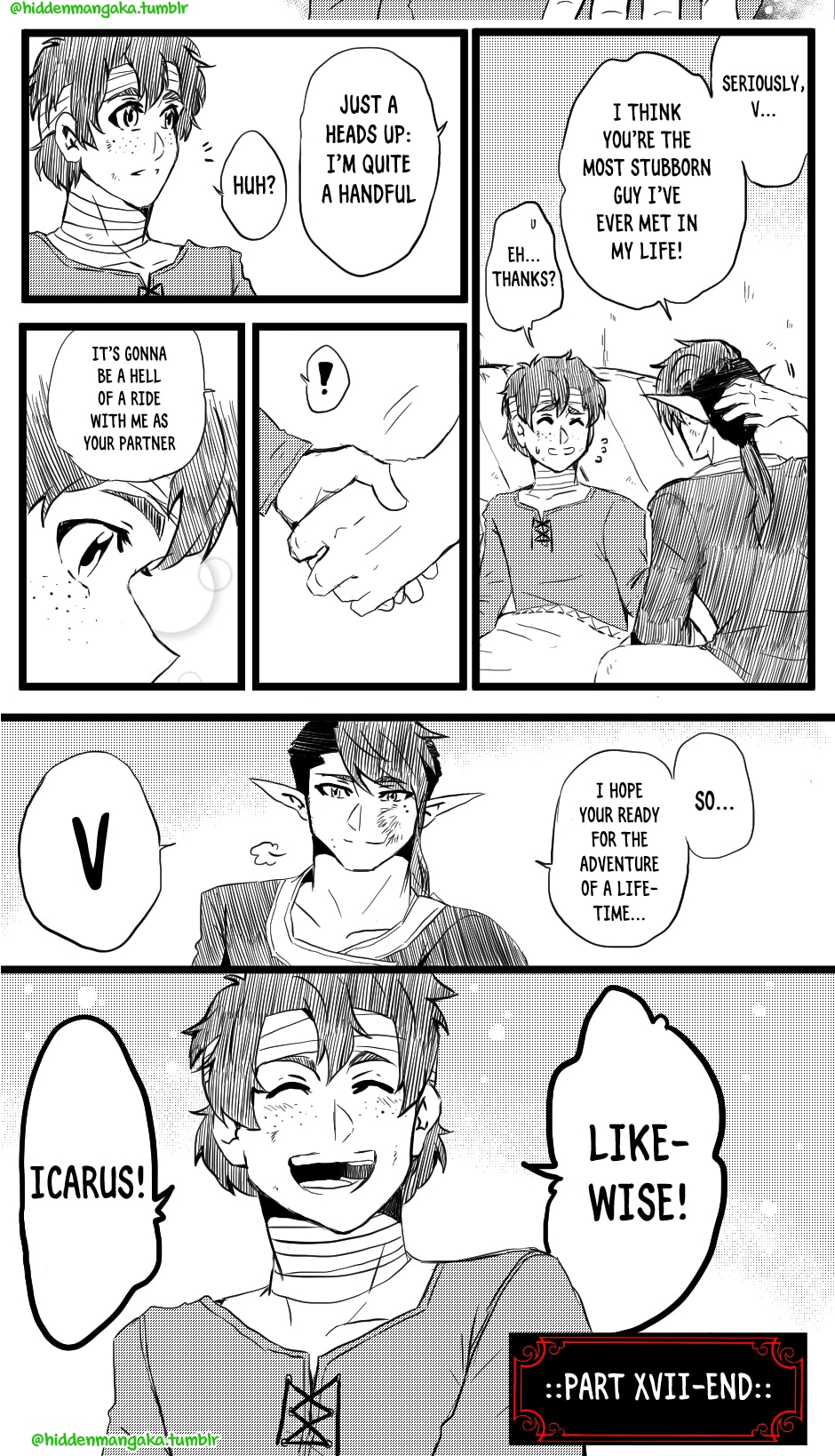 In this fantasy-adventurer AU, V (thekao) is a witch-class adventurer everyone avoids; due to his clumsiness and inability to perform his spells successfully in front of others, V is humiliatingly known by the other adventurers as "V the Destructor." But when the enigmatic Icarus (icarusmask) joins him, V soon gets involved in a crisis that involves Icarus and the entire kingdom!