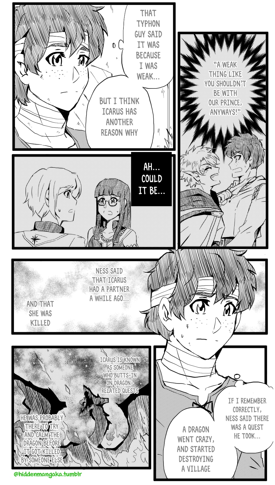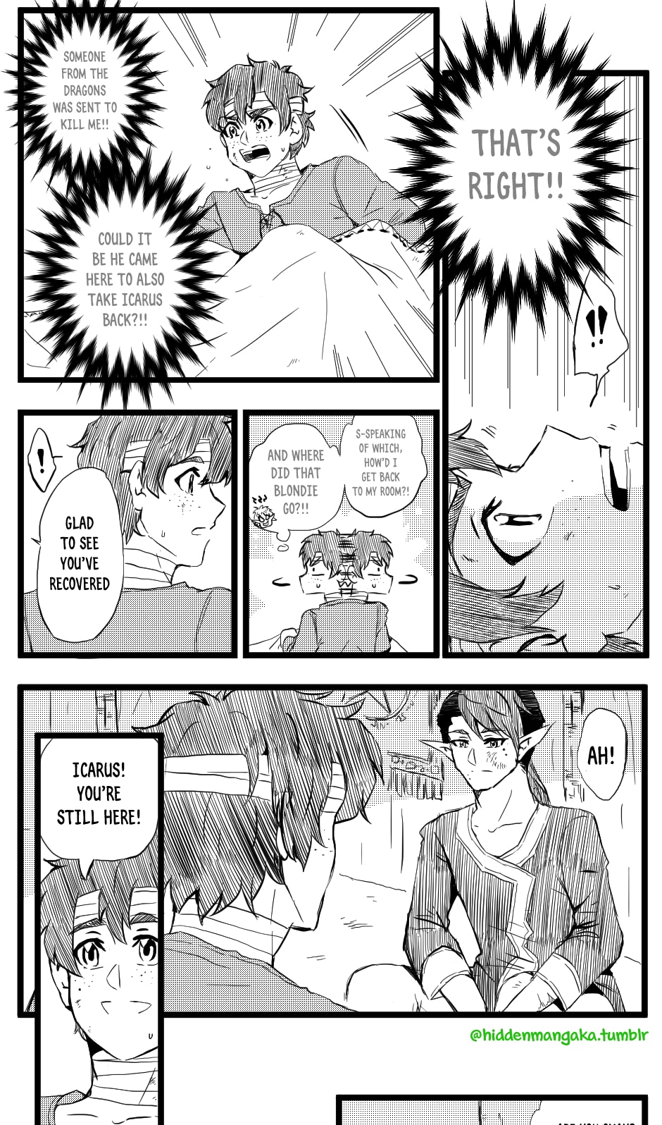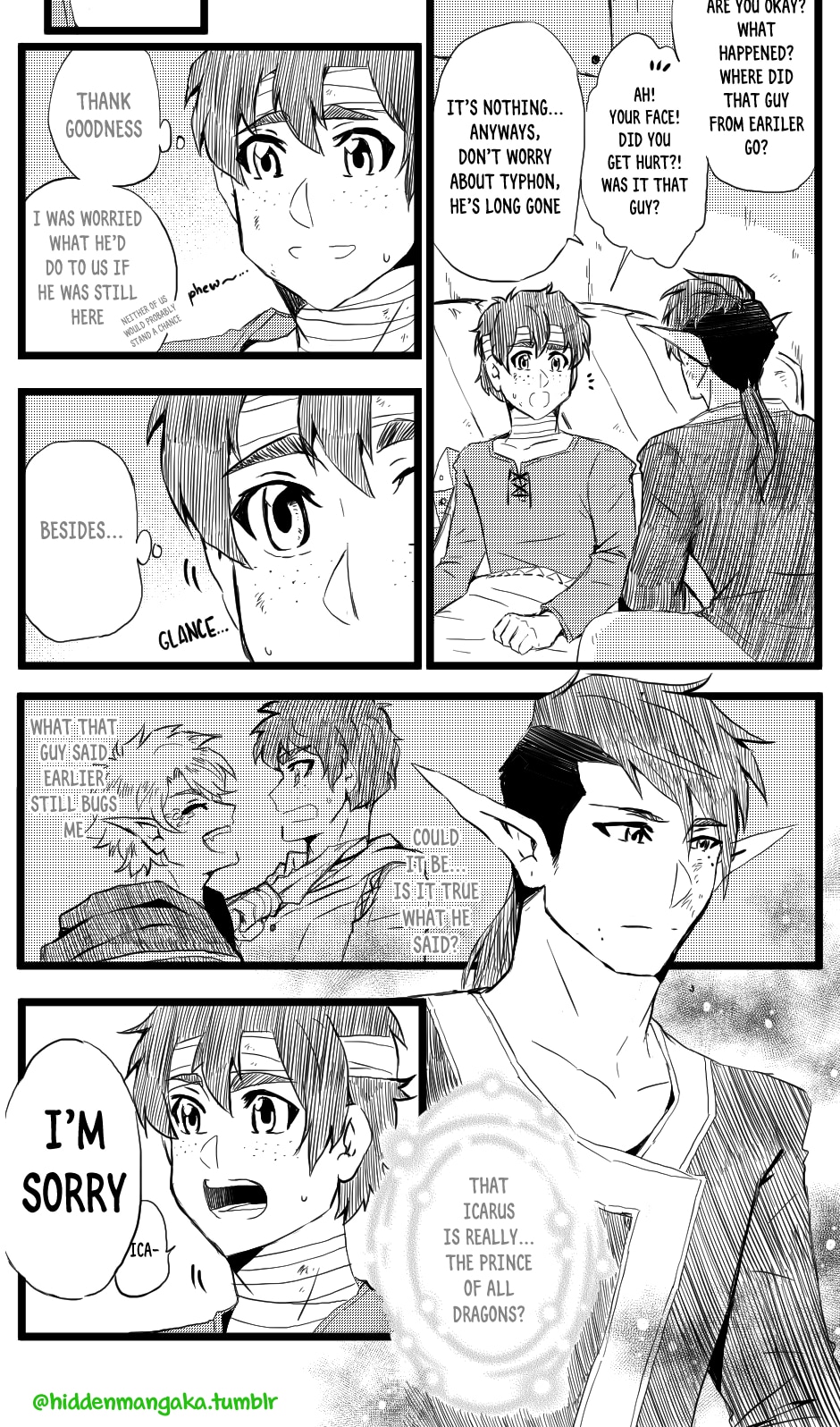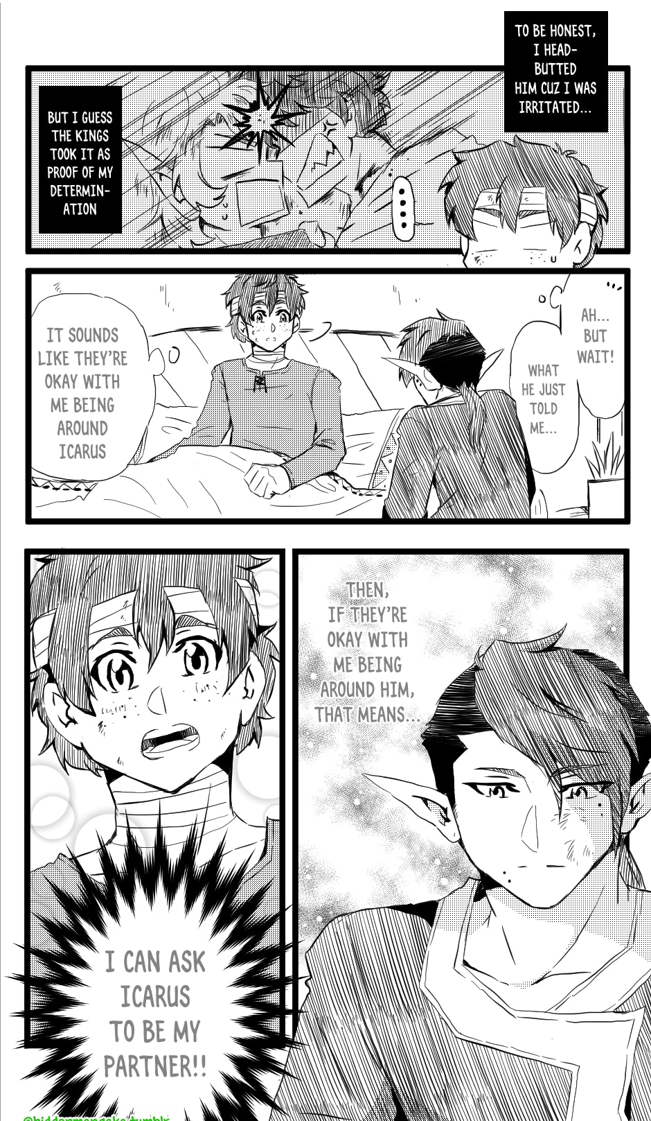 In this fantasy-adventurer AU, V (thekao) is a witch-class adventurer everyone avoids; due to his clumsiness and inability to perform his spells successfully in front of others, V is humiliatingly known by the other adventurers as "V the Destructor." But when the enigmatic Icarus (icarusmask) joins him, V soon gets involved in a crisis that involves Icarus and the entire kingdom!