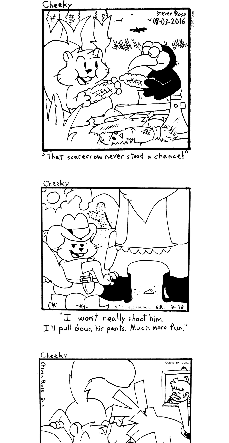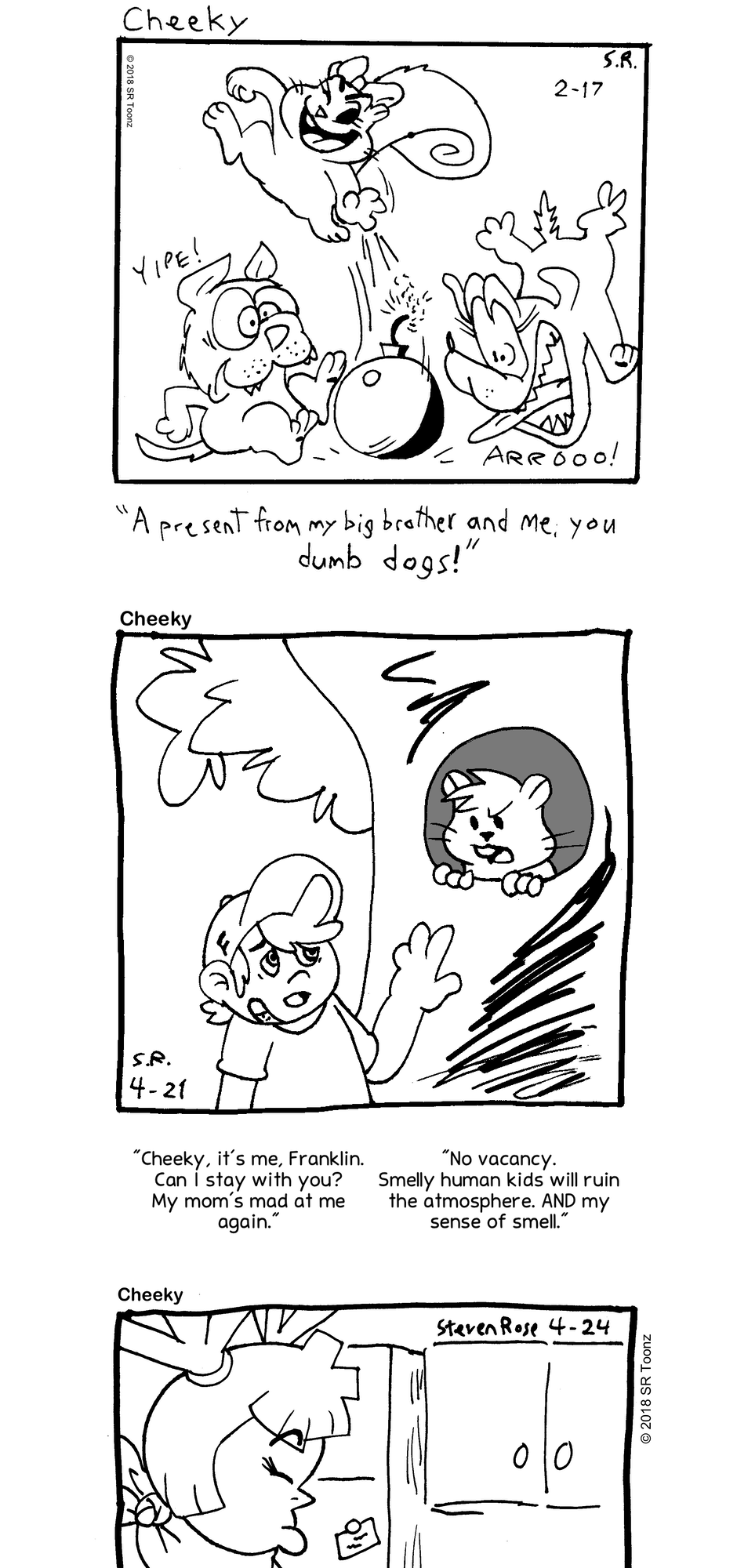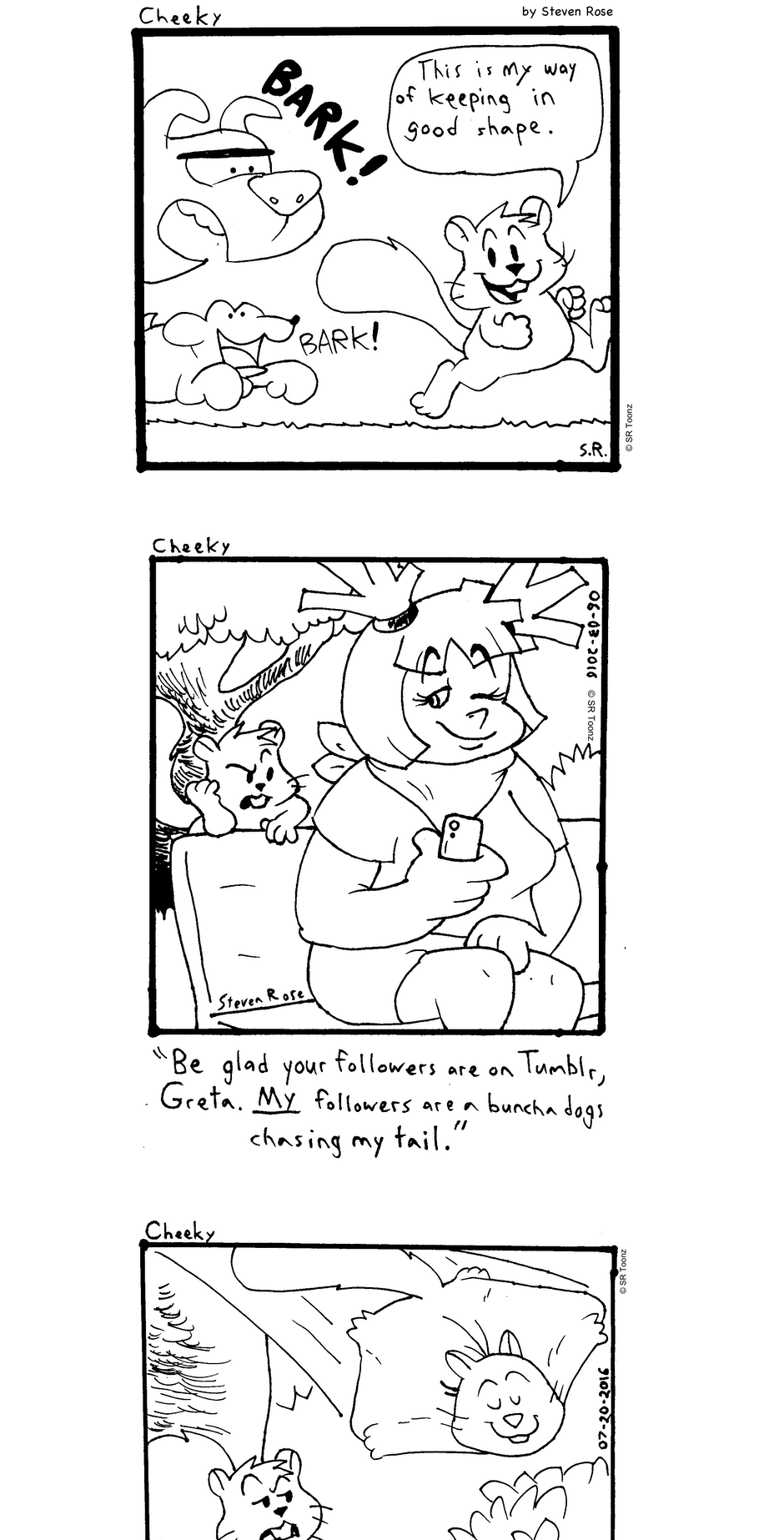 Whether it's tormenting dogs at the park, romancing with Miss Pin-Up, trying to lift the spirits of timid young Franklin Fowler, hanging out with Greta, or just causing destructive mayhem, Cheeky (and his little sister Nougette) gotta do what a squirrel's gotta do!