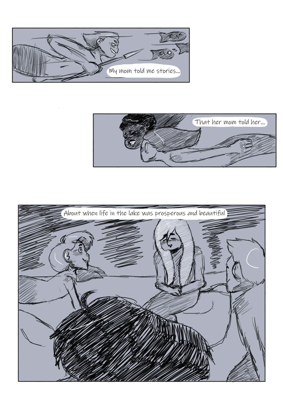The flashback panels will be done in blue to help with readability since the storyline will be jumping between the present and the past.