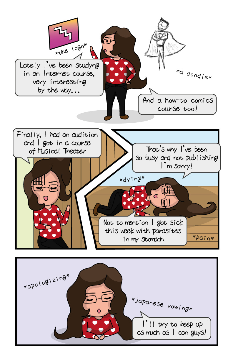 Helloooo! Well, what you see here is the final task I had to do in a course I've been doing for over a month about Creation of Comics! So... Is like a special chapter. I've been so busy lately! I'm sorry! But this course has ended, now I have to finish the other one I have via Internet and I will be only with the Musical Theater one, which will give me more time before I start one of Dutch Language Basics... I'm sorry! I'm a mess!