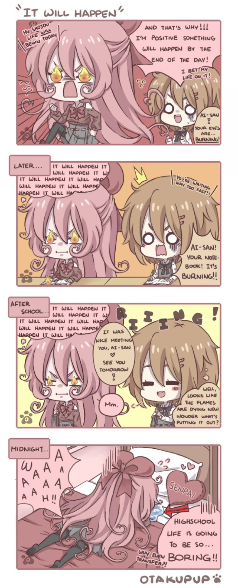 Hahaha, those flames. Ai-chan just wants a shojo life so muchXD Don't worry Ai-chan you'll get your shojo soon! I hope.... I'd be worried about her not having her notes, but I get the feeling she wouldn't be studying unless it's a study session with a senpai or something XD That senpai pillow tough. I want one of those.