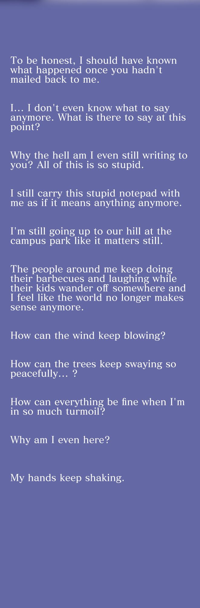 And now that you're gone, all I have to give are these letters: all of my pain, all of my love... and my regrets -- all in here. Inside my collection of memories.