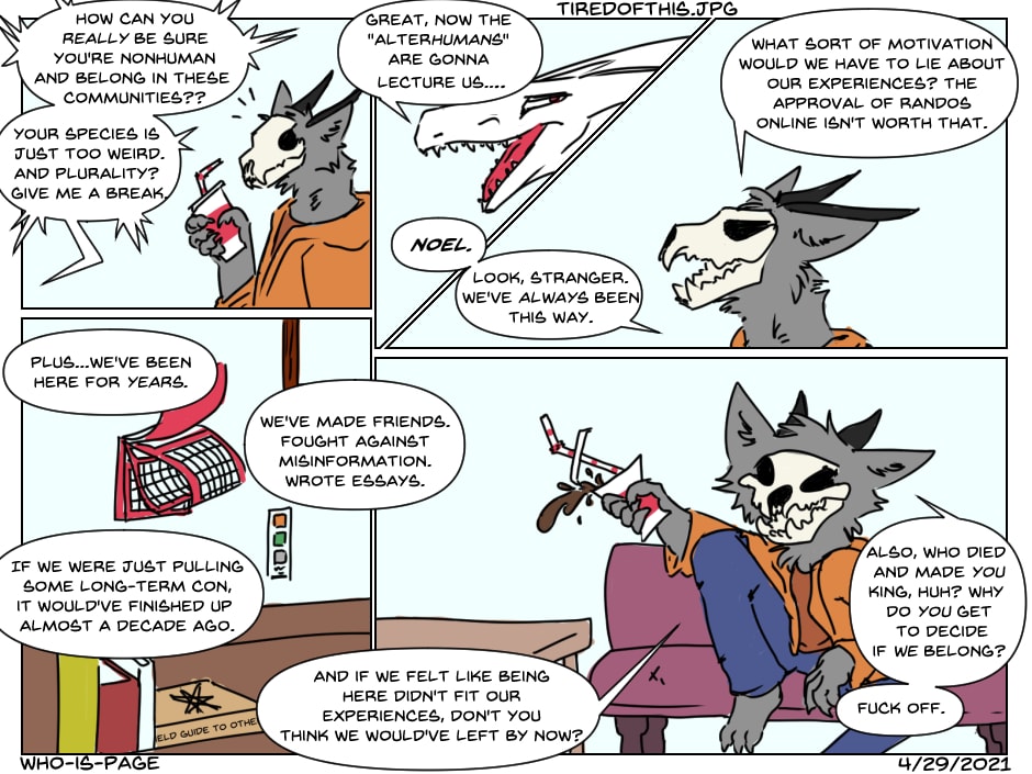 Shenani-kins is an internet comic strip about the wonderful weirdness of nonhuman shenanigans in a human world. Made with otherkin, therian, and alterhuman experiences in mind, Shenani-kins hopes to put forward awareness and familiarity of nonhuman communities in a more lighthearted, fun way.