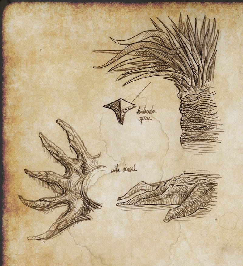 The central body consisted of a kind of fleshy cylinder the diameter of a human torso, elastic and covered with horizontal wrinkles similar to growth rings. This ratty gray trunk rested on what at first glance looked like a root system, but actually consisted of a muscular expansion of the trunk in the shape of an inverted funnel approximately one meter in diameter. This muscular foot was similar to those of the gastropods, although unlike the common snail it was aided for its momentum by a series of tendinous and skeletal structures that extended radially, intersecting each other.