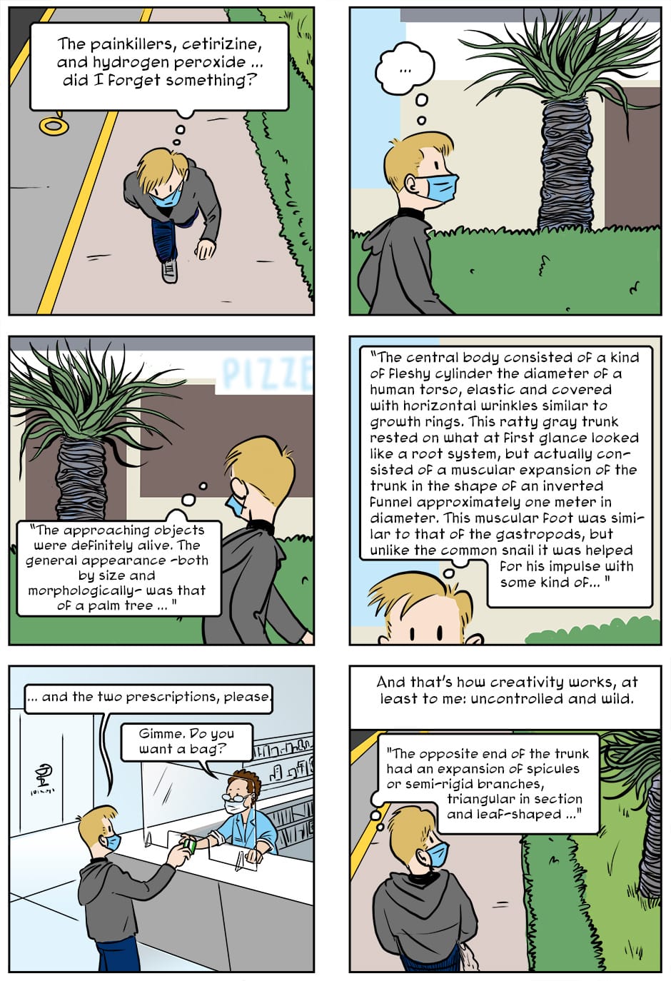 This Dracaena draco tree inspired me and also, I wonder how easily we take for granted living with a gigantic living thing (say, a palm tree). But if we had a 30-foot barnacle in our garden, horror would be assured.