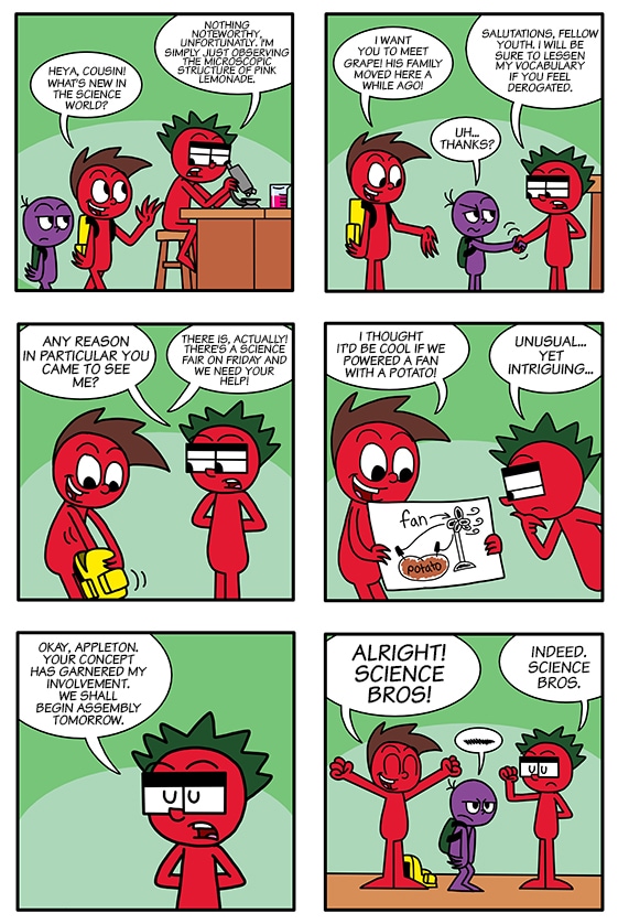 Apple and Grape look to Apple’s cousin Tomato for help with their science project.