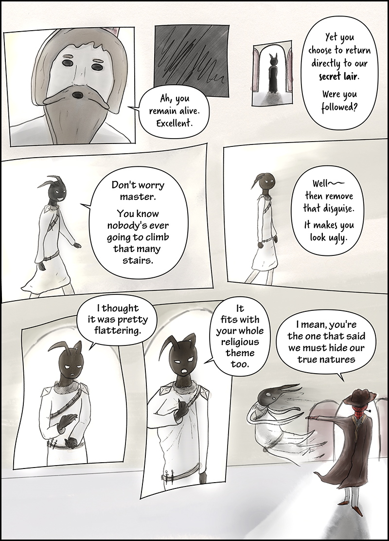 I have less time for this comic because right now grad school is drowning me with work. So I'm changing the update schedule to a slower one: every other week on Wednesday. This way I can give you multi-page updates instead of a bunch of single page updates.