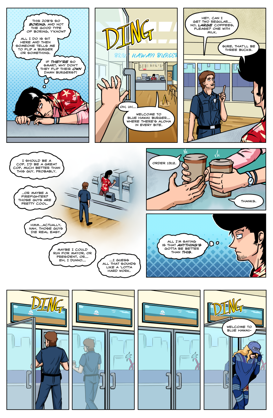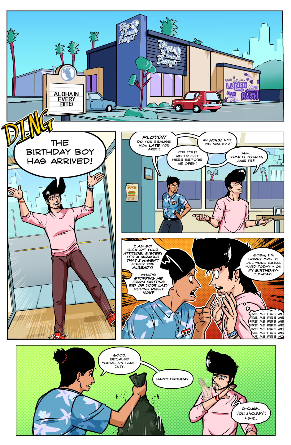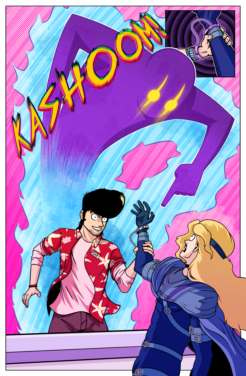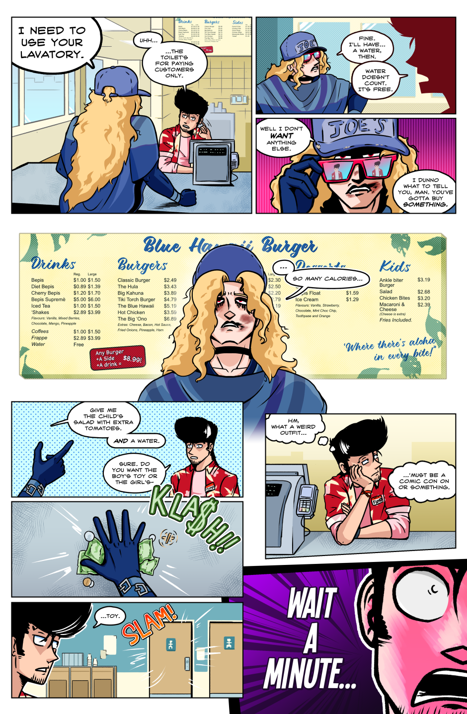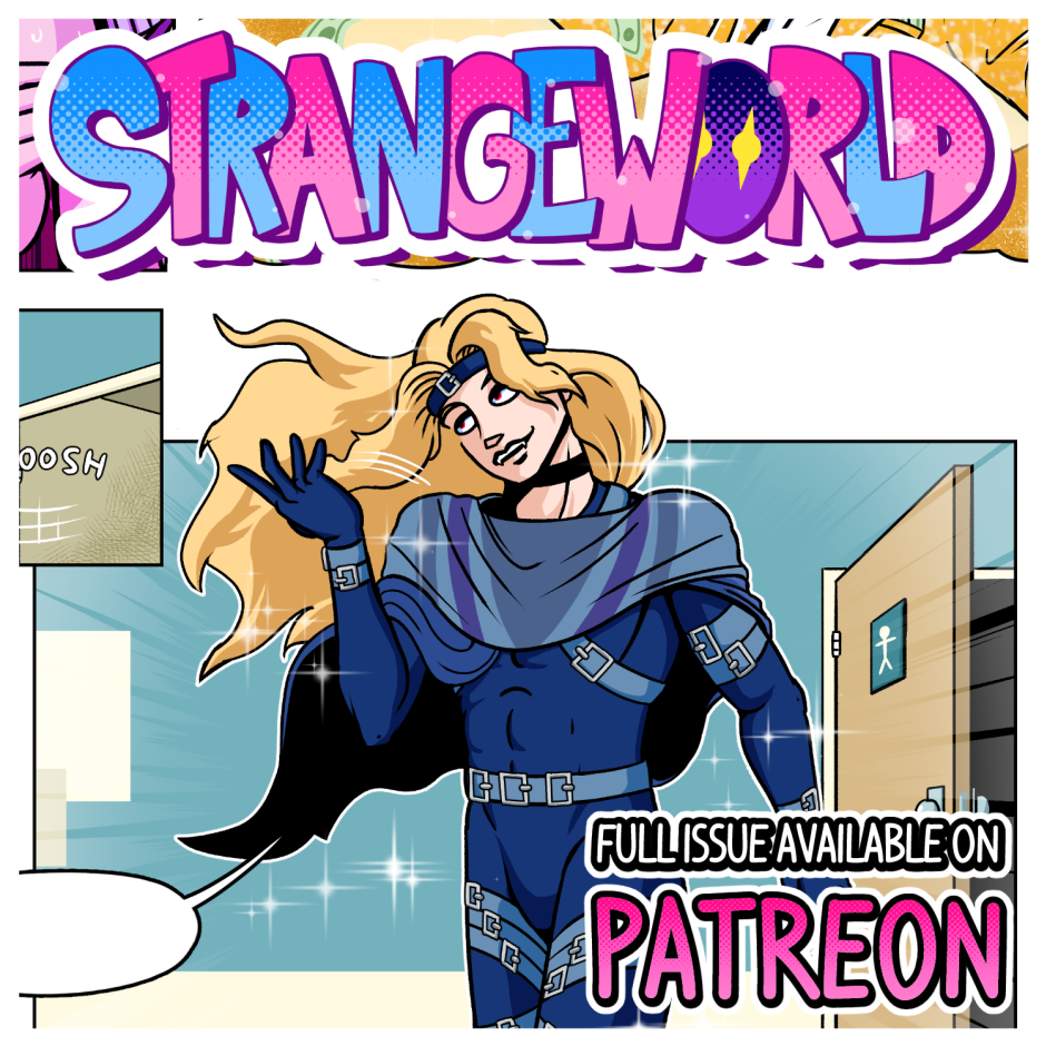 In a world in which superpowered individuals called "Star Children" are born once a year; we follow the journey of the lone Vampire thief Axel Bloodhenge (and his new "friend": Floyd), as they travel the U.S.A. in search of his stolen Vampire Artefacts. Who were the men that robbed Axel? What do they want with him? Why won't he eat a perfectly good Burrito!? The answers to these questions and MORE can be found in the pages of STRANGEWORLD!