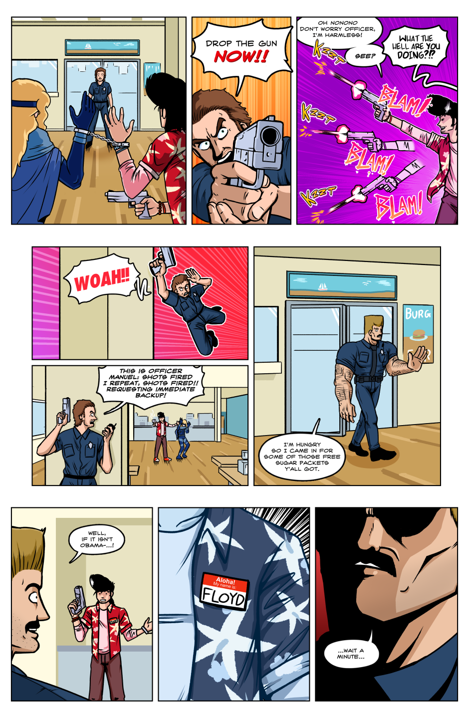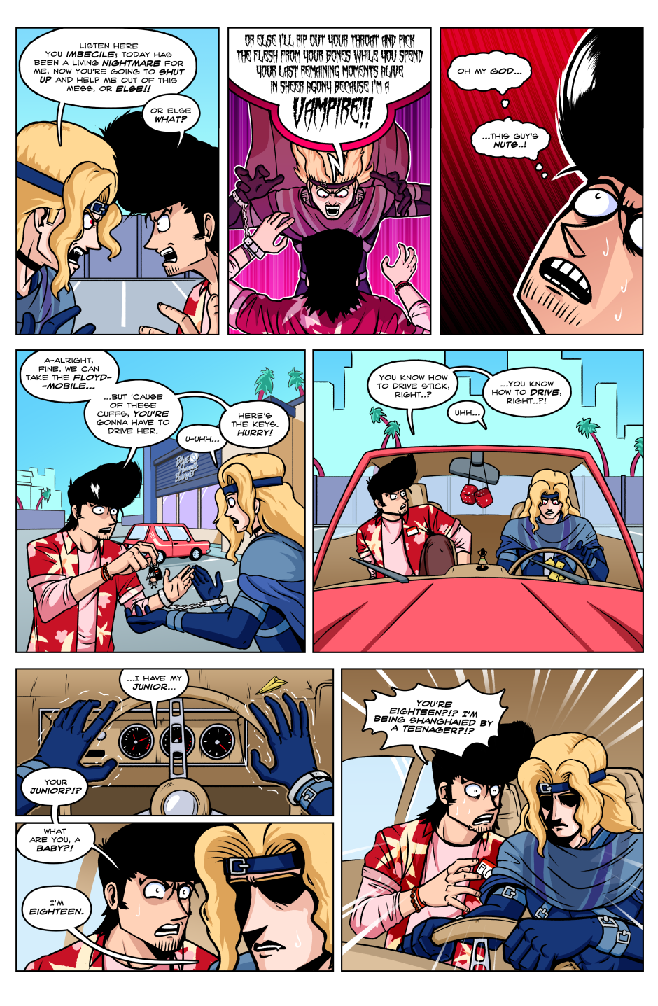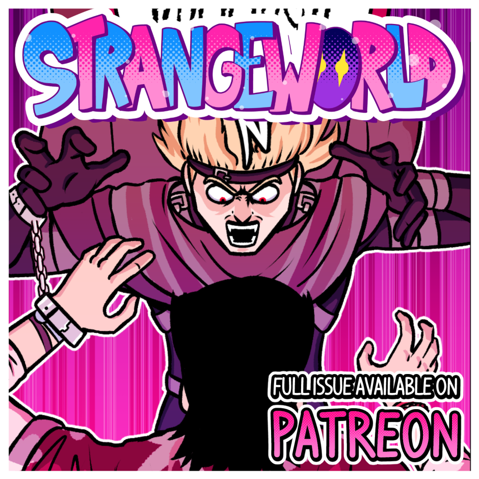 In a world in which superpowered individuals called "Star Children" are born once a year; we follow the journey of the lone Vampire thief Axel Bloodhenge (and his new "friend": Floyd), as they travel the U.S.A. in search of his stolen Vampire Artefacts. Who were the men that robbed Axel? What do they want with him? Why won't he eat a perfectly good Burrito!? The answers to these questions and MORE can be found in the pages of STRANGEWORLD!