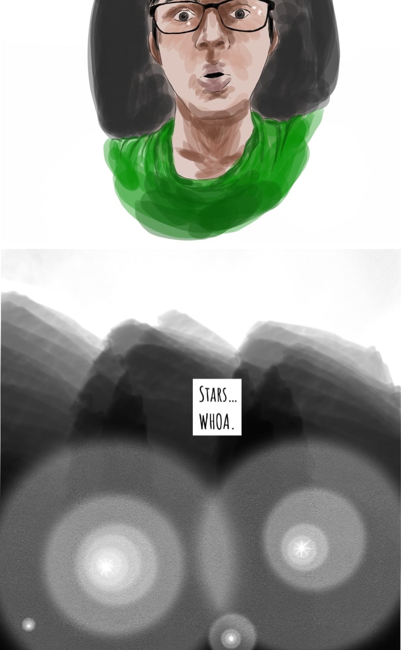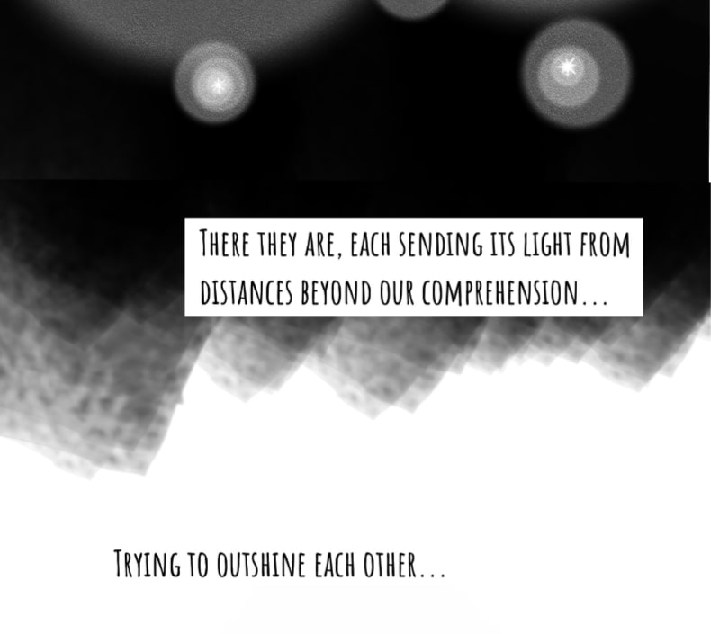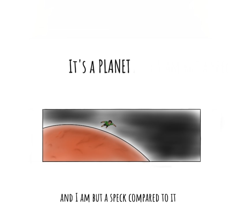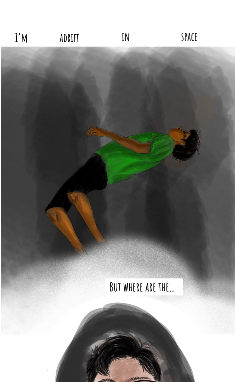 Fun fact- I have used a slightly different coloring style for each illustration of the "space" sequence. Suggest me a better, non-spoiler title for this comic than the one I thought of. If I like it, I'll use it instead.