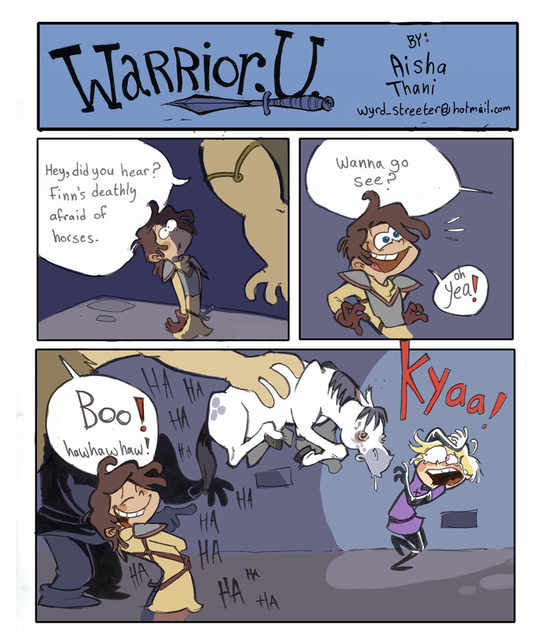 Warrior U follows the adventures of Finn, a small, effeminate, unruly young lad, and his rise to, almost unachievable, manhood. He WANTS to take a course on becoming a bard, but instead ends up, like so many of us do, in a completely unrelated class that he HAS to pass if he wants to get anywhere. That class is warrior class where he befriends the reluctant Harv.