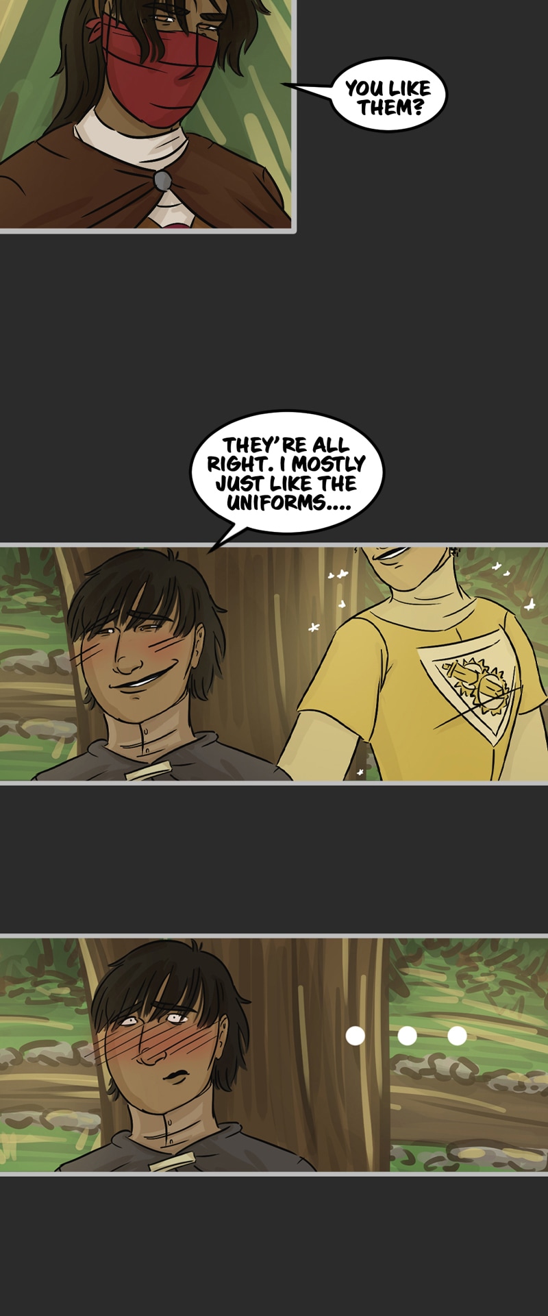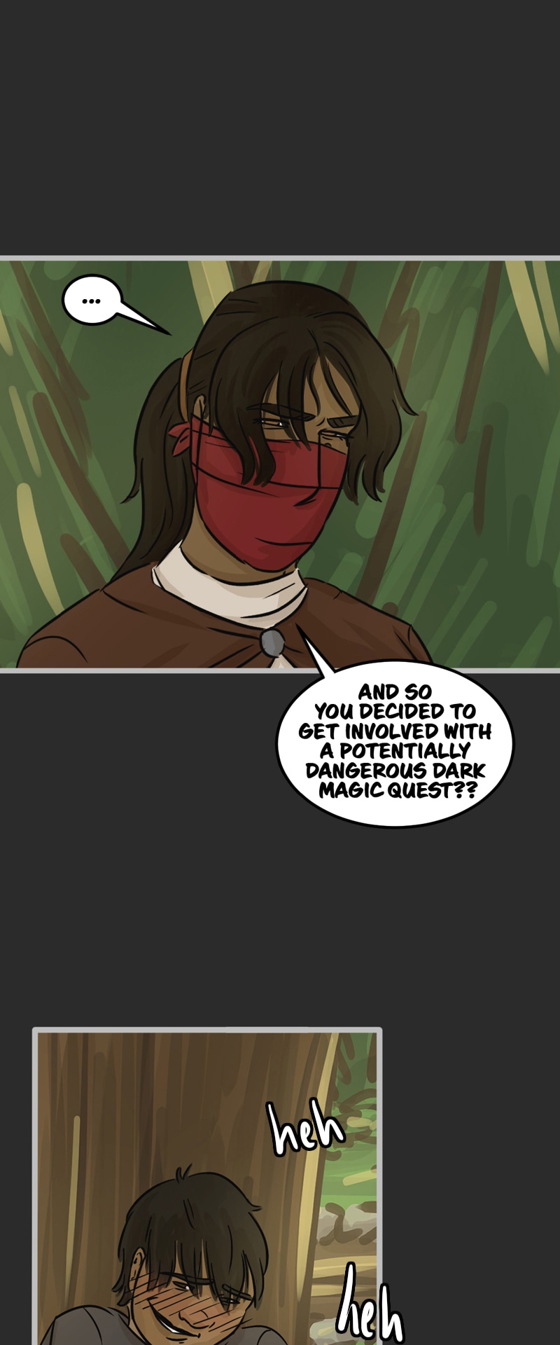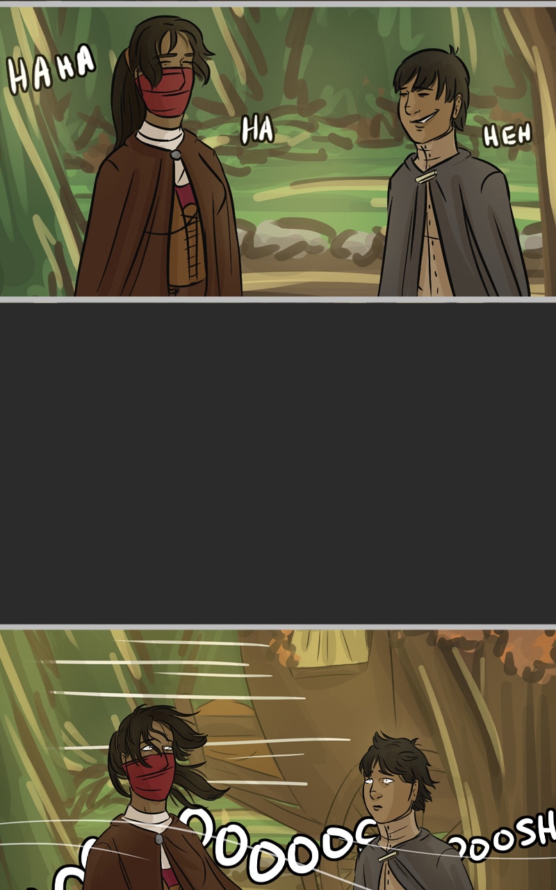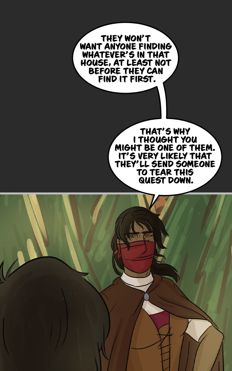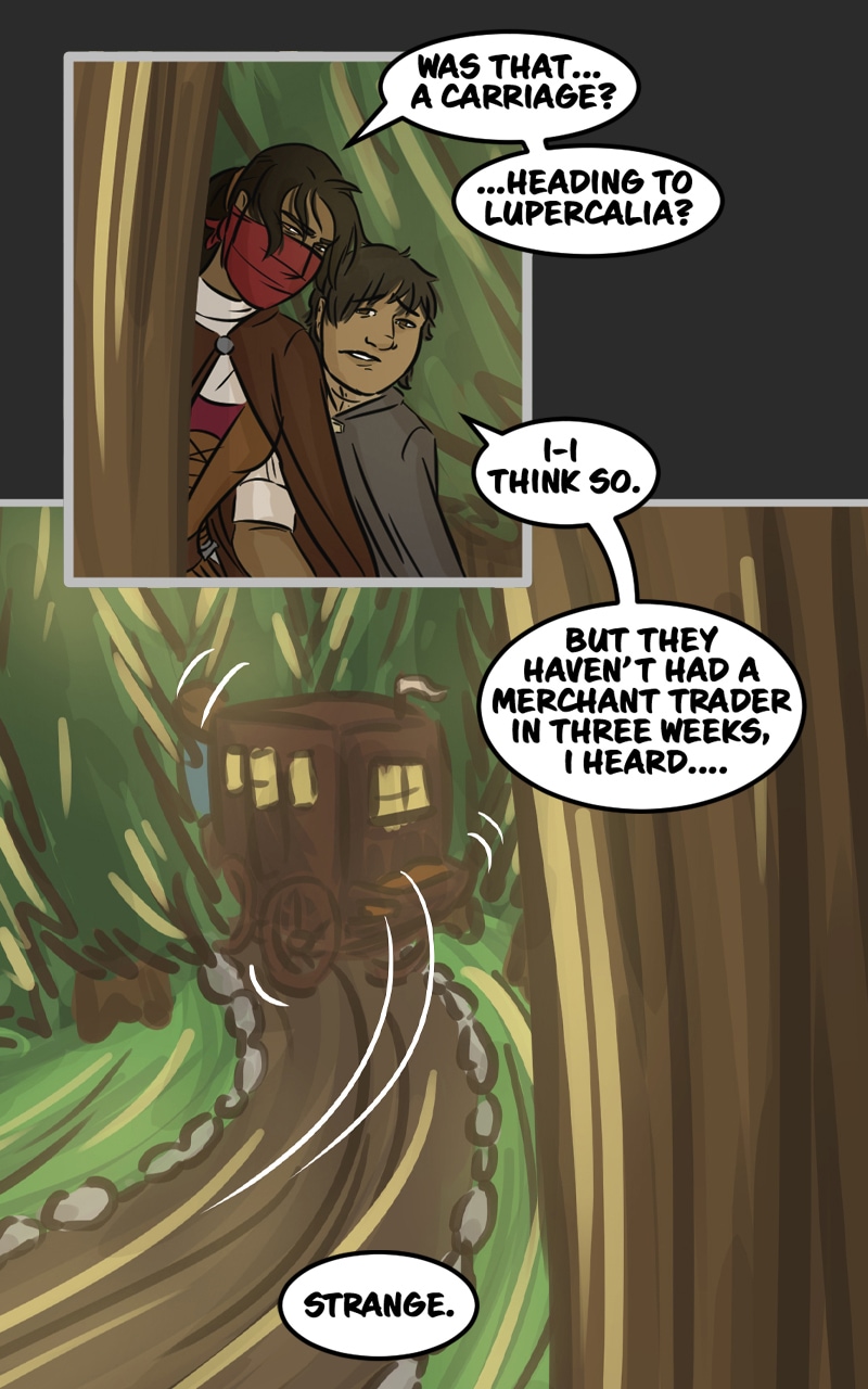 In the kingdom of Tenebria, where magic is fueled by fire and the status quo is king, waves are made when a noble lord and his daughter suddenly disappear, leaving behind them only rumors and a mysterious letter. Four unlikely heroes must answer the call and solve the mystery of an abandoned house and its terrifying monster -- and they discover in the process that nothing is truly as it seems. Featuring a found family, queer romance, and big fluffy birds. Updates every other Monday.