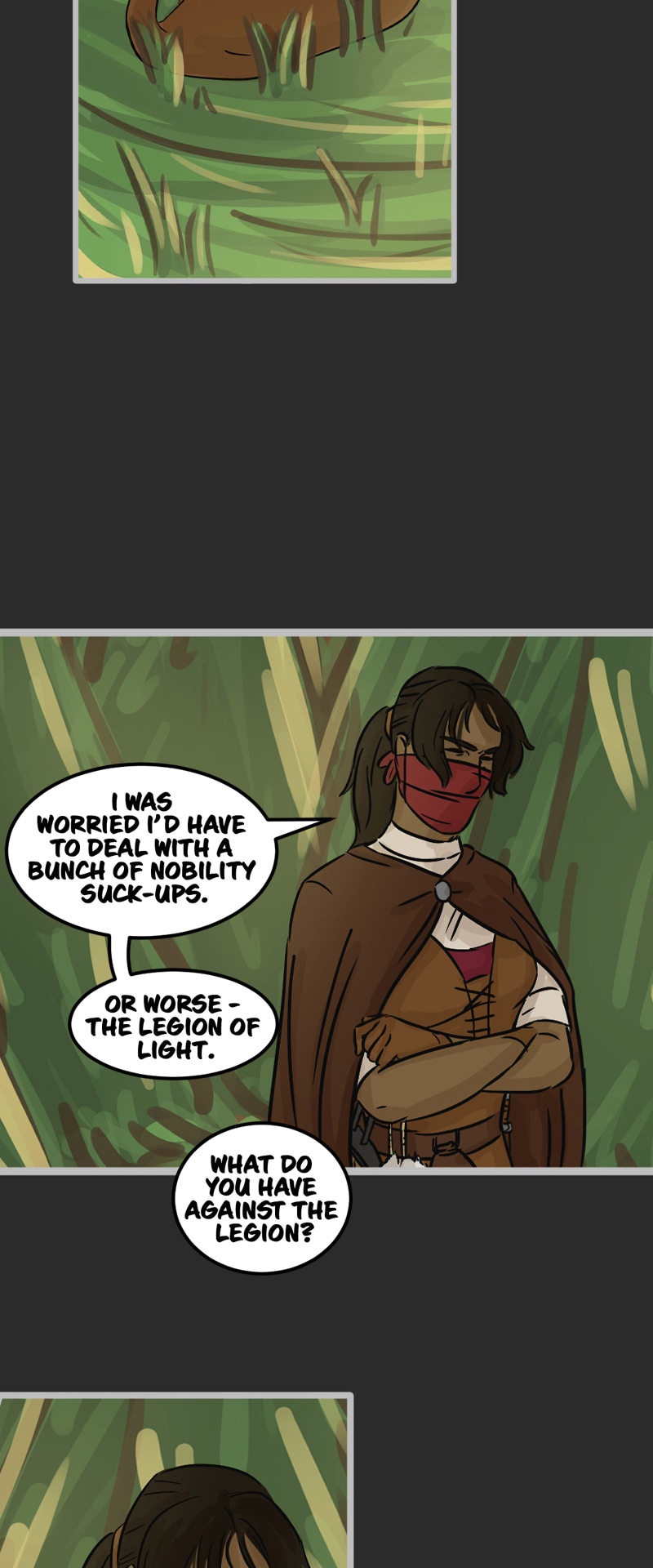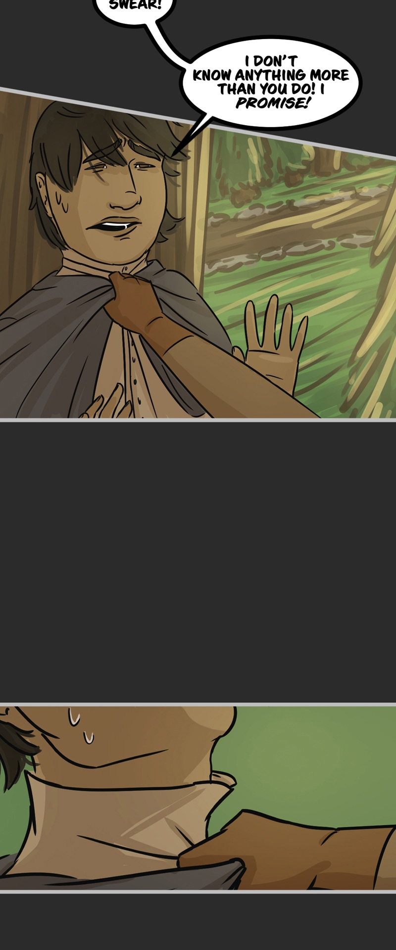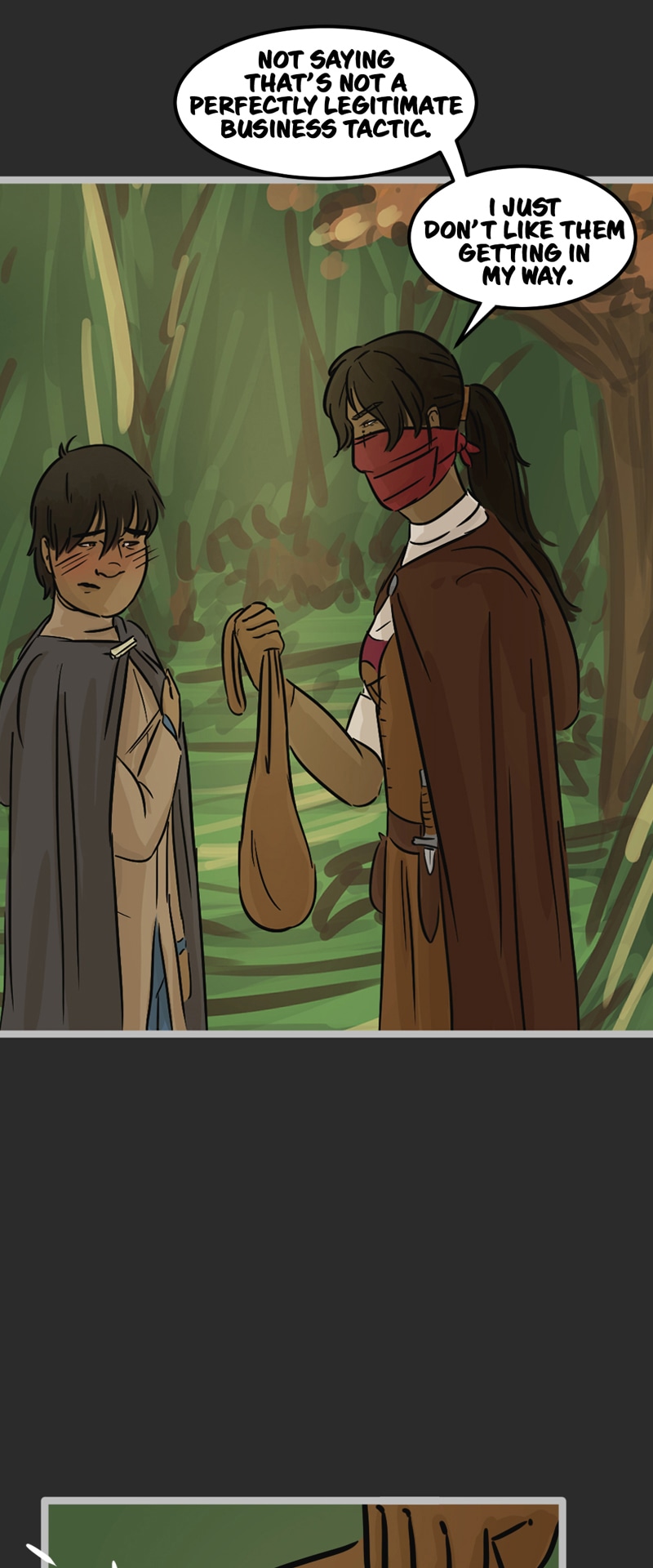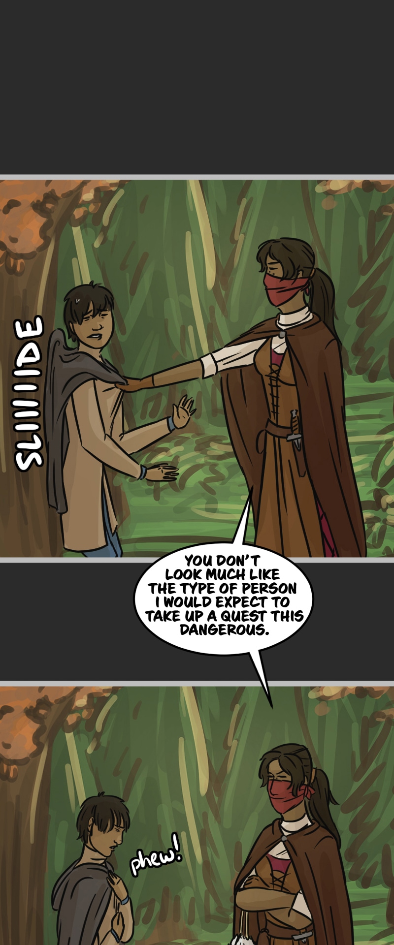 In the kingdom of Tenebria, where magic is fueled by fire and the status quo is king, waves are made when a noble lord and his daughter suddenly disappear, leaving behind them only rumors and a mysterious letter. Four unlikely heroes must answer the call and solve the mystery of an abandoned house and its terrifying monster -- and they discover in the process that nothing is truly as it seems. Featuring a found family, queer romance, and big fluffy birds. Updates every other Monday.