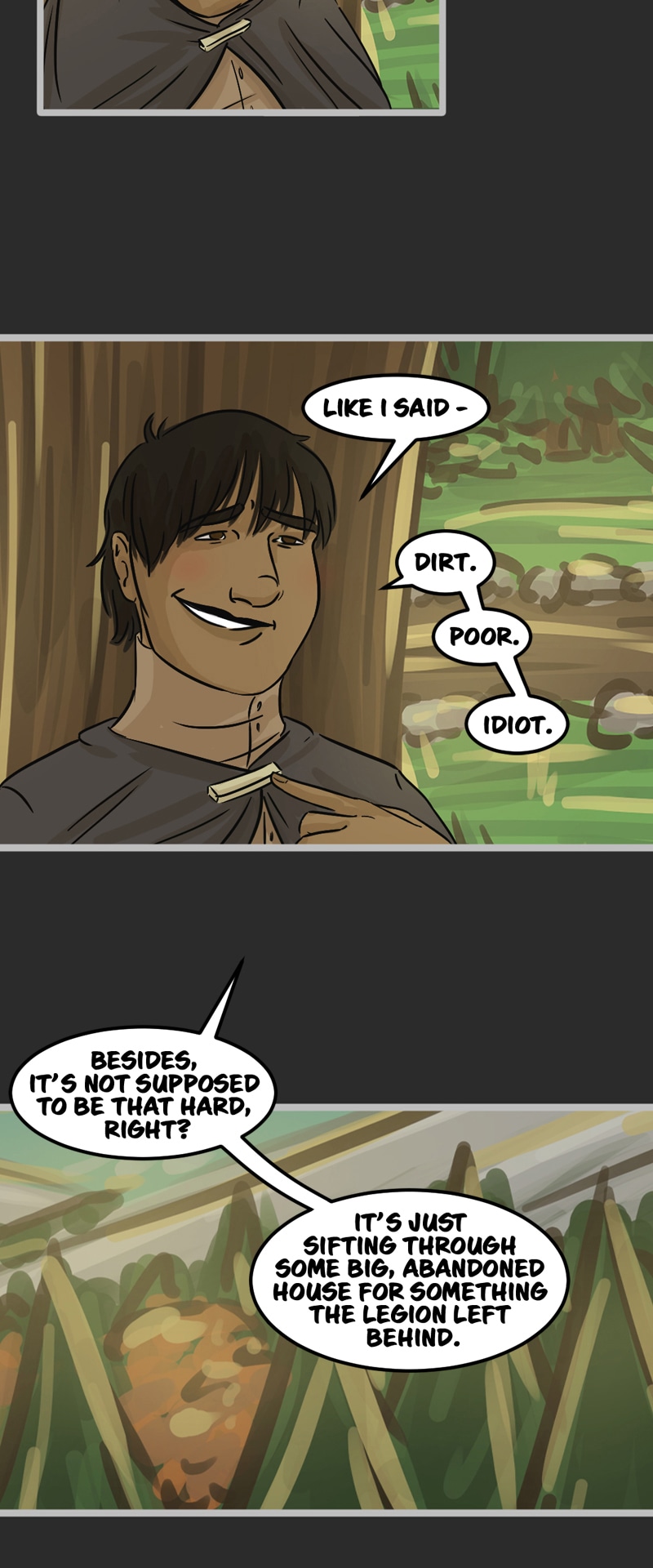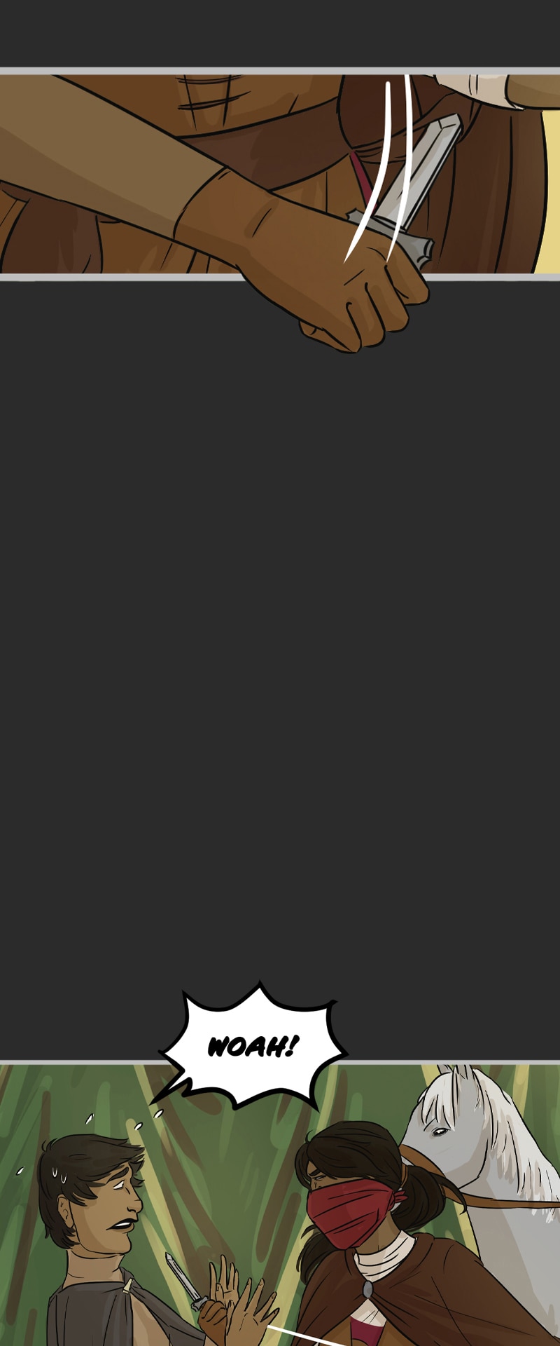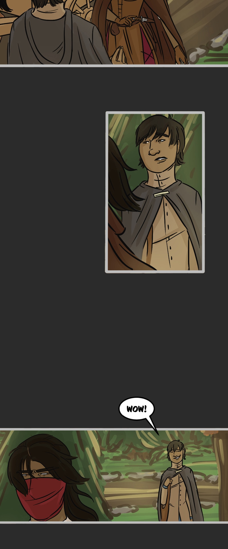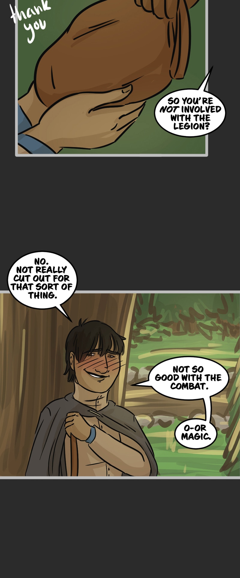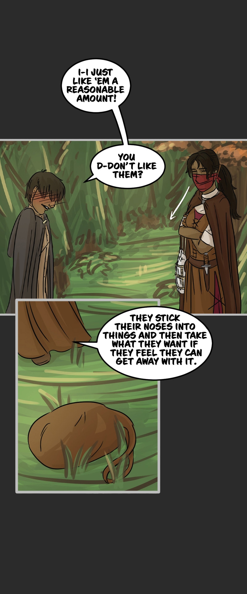 In the kingdom of Tenebria, where magic is fueled by fire and the status quo is king, waves are made when a noble lord and his daughter suddenly disappear, leaving behind them only rumors and a mysterious letter. Four unlikely heroes must answer the call and solve the mystery of an abandoned house and its terrifying monster -- and they discover in the process that nothing is truly as it seems. Featuring a found family, queer romance, and big fluffy birds. Updates every other Monday.
