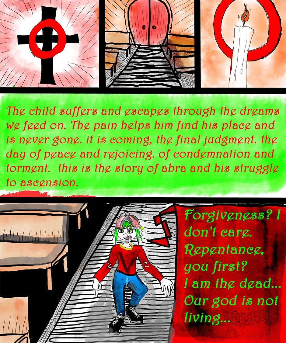 was inspired by the vibe of the videogame draw to death (which is set inside of troubled teens journals) and thought what if I make a comic that I would have made in high school. it is a surreal barely coherent comic about a kid with an abusive father (his father is a ninja) who gets transformed into a monster by god so he can join a contest of ascension.