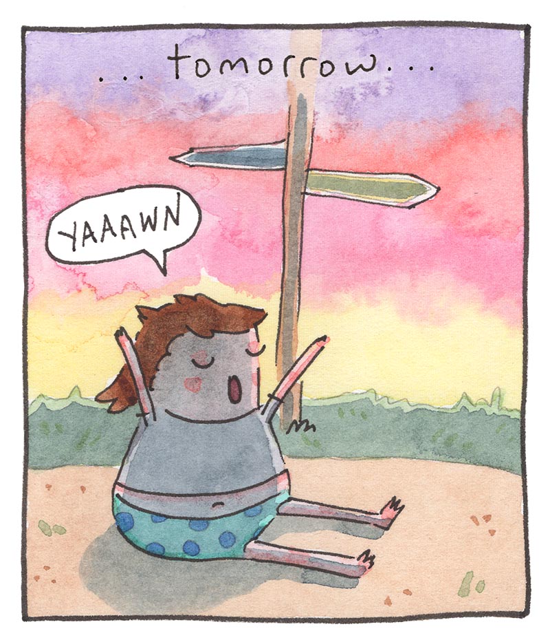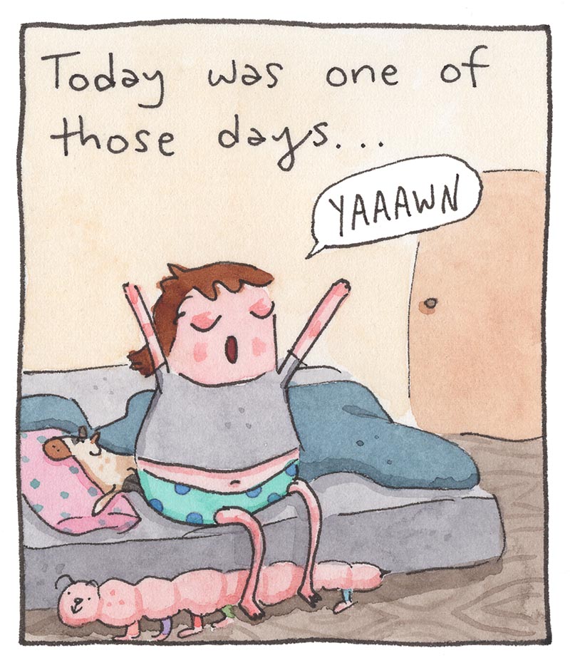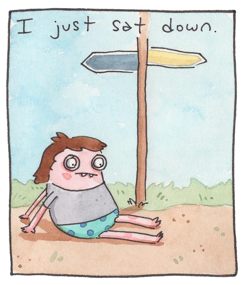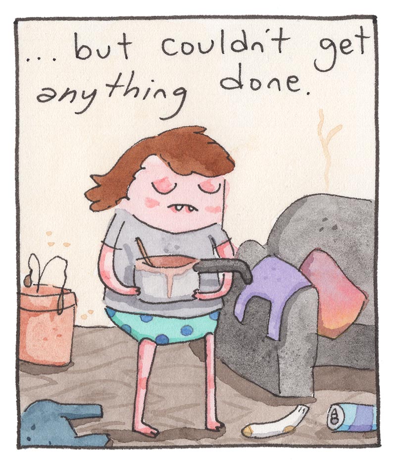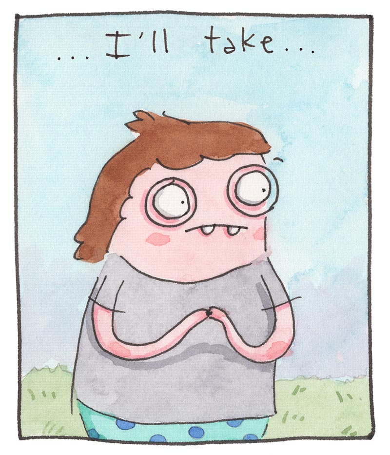 My inspiration comes from just bein’ alive, feelin' feelings, and drawing about 'em. Every comic is made the old-timey way in watercolor, then put online the new-timey way for humans like you to read!