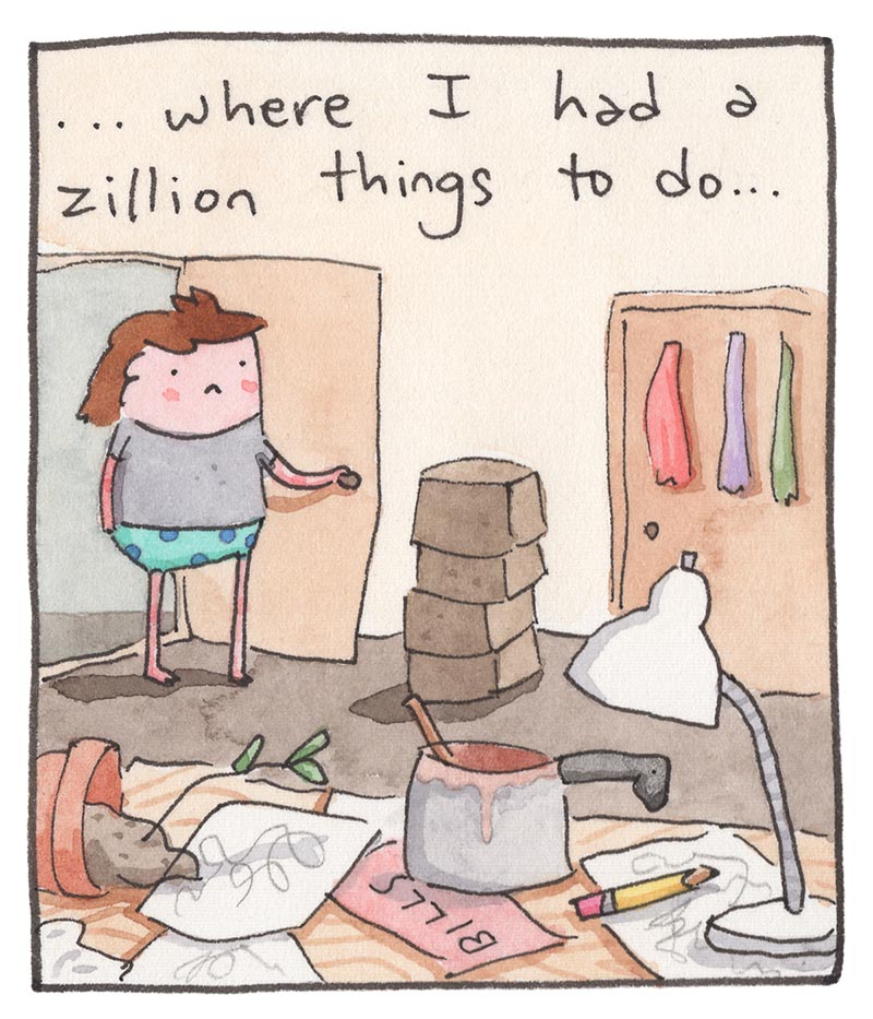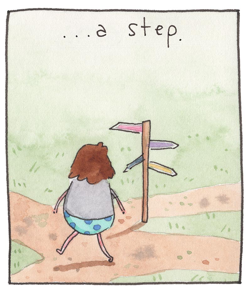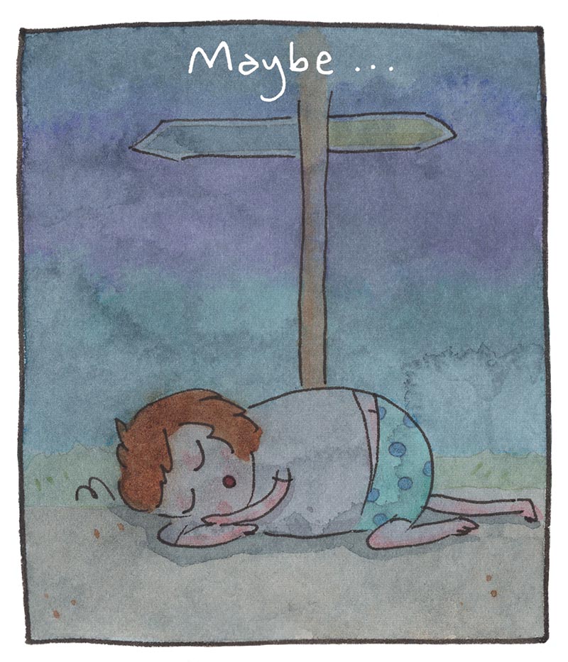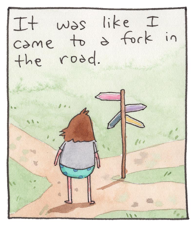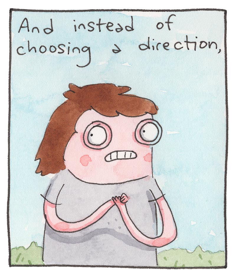 My inspiration comes from just bein’ alive, feelin' feelings, and drawing about 'em. Every comic is made the old-timey way in watercolor, then put online the new-timey way for humans like you to read!