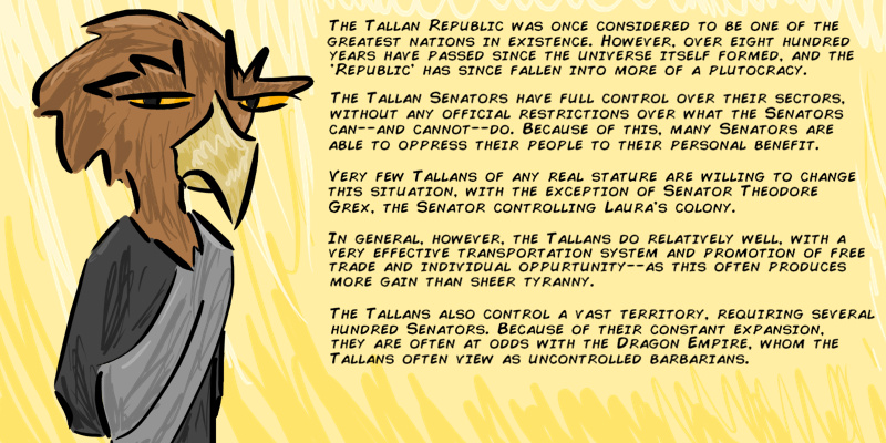 Ah, Tallans. I made these guys up loooong ago; back before I came up with the stories that would later explode and reform into this universe with a magic box in the middle. Although the Tallans certainly have fallen from their old glory... More on that later.