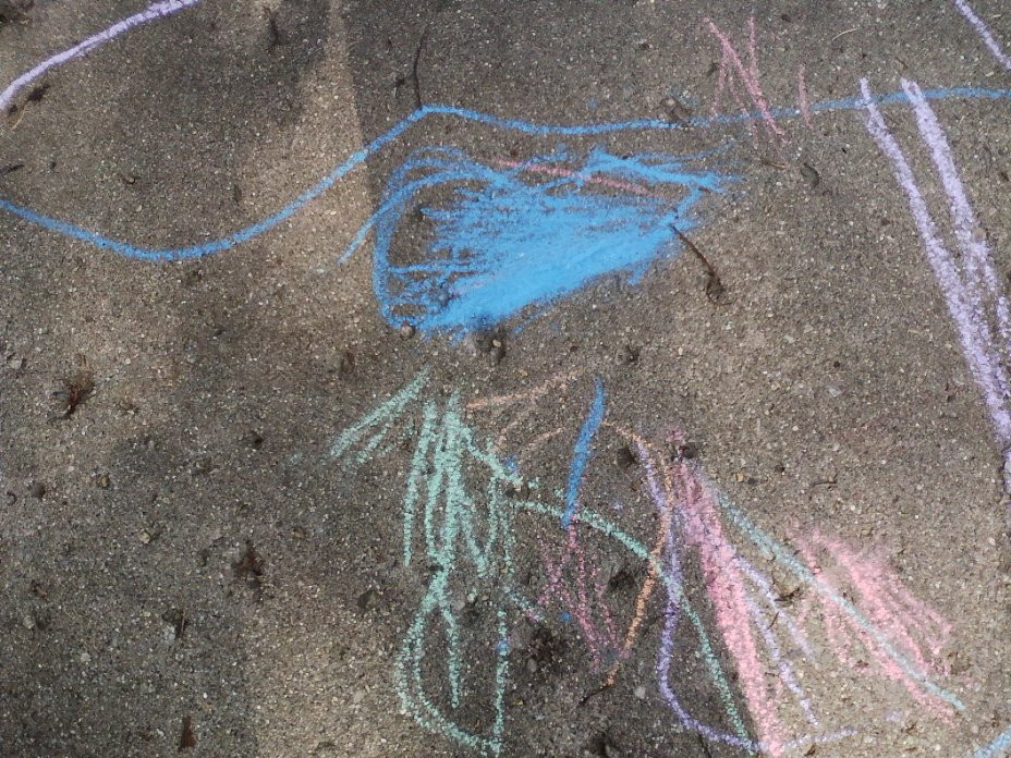 I have two pictures of drawings from the summer. My kids love using sidewalk chalk on our driveway. The first is titled "Submarine" it was drawn by my son who was five at the time. As you may see, the submarine has quite the unusual shape. The second drawing has no name but was drawn by my daughter who was two at the time.