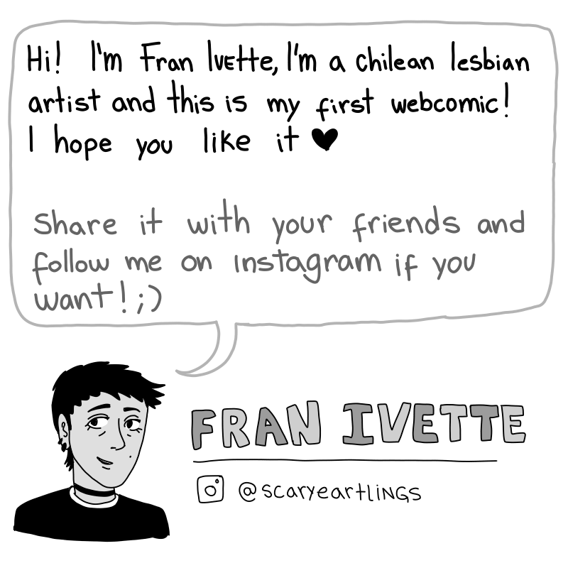 ~I'm Fran Ivette, a chilean lesbian artist, and this is my first webcomic, i hope you like it <3 share it with your friends and follow me on instagram ;) @scaryearthlings~