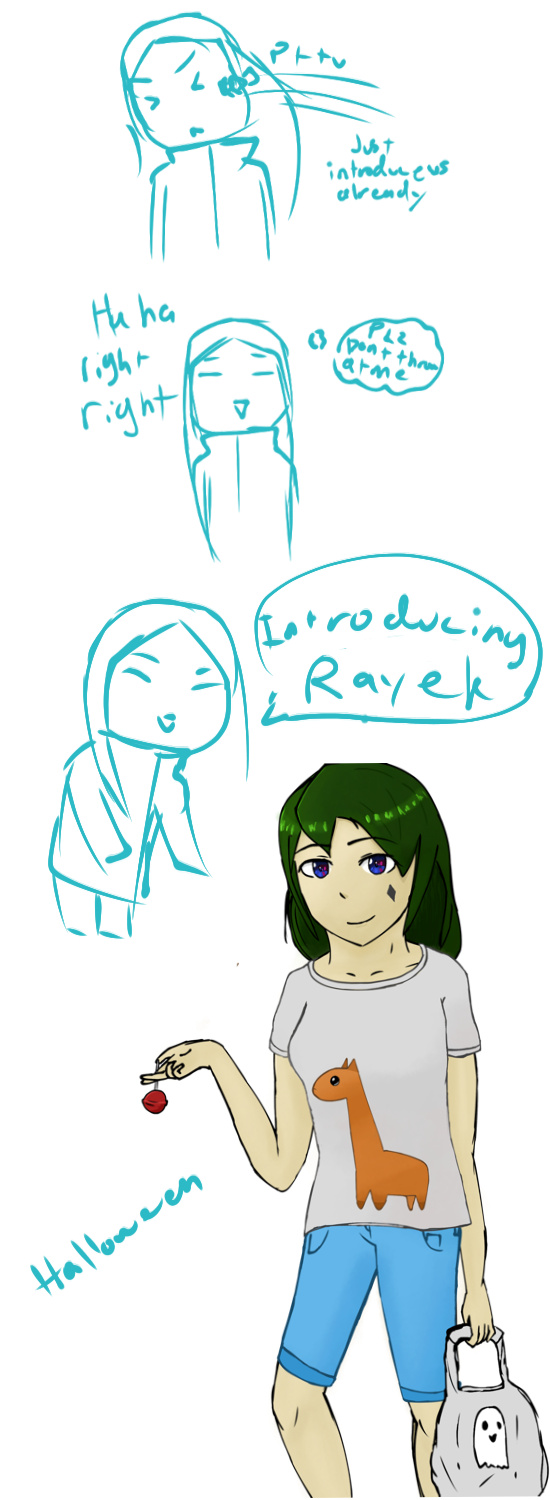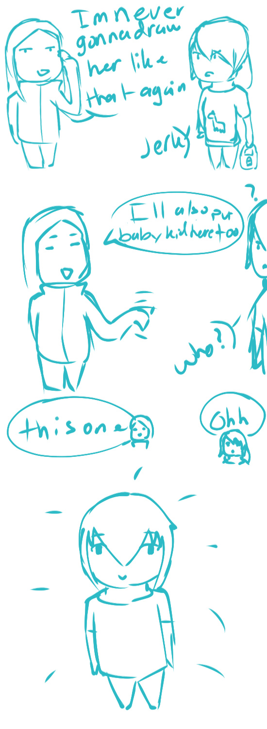 I derped up baby kid's face there.. Oh well But yah im pretty much gonna put my oc's on here cuz there are like no one but me on here. And yah rayek has been on one of these comic strips before