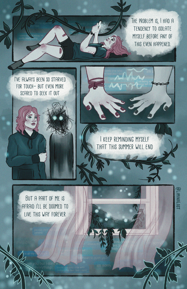 A vent comic I created to explore some feelings I was grappling with during the summer of 2020, which was mostly spent in quarantine. My mental health had really tanked at this point and even as a very introverted person, I had a hard time being so isolated.