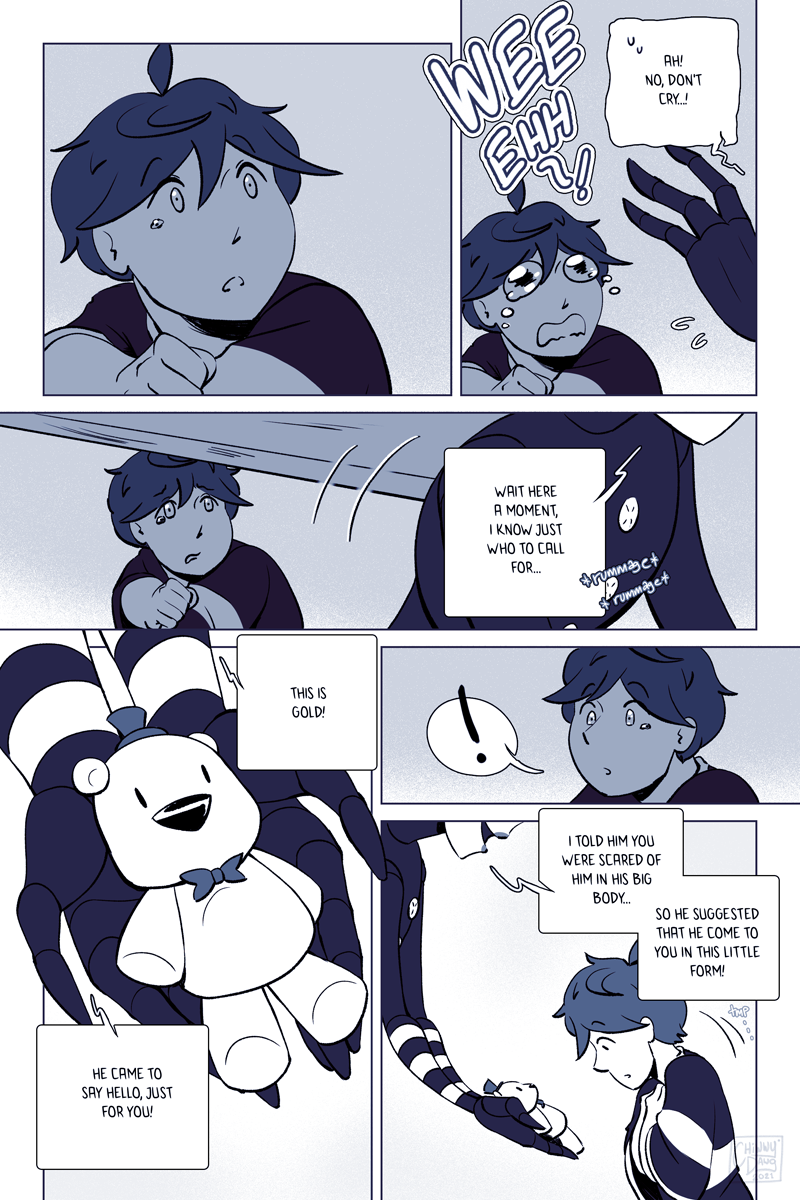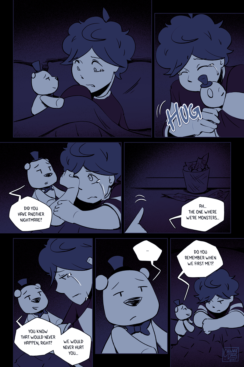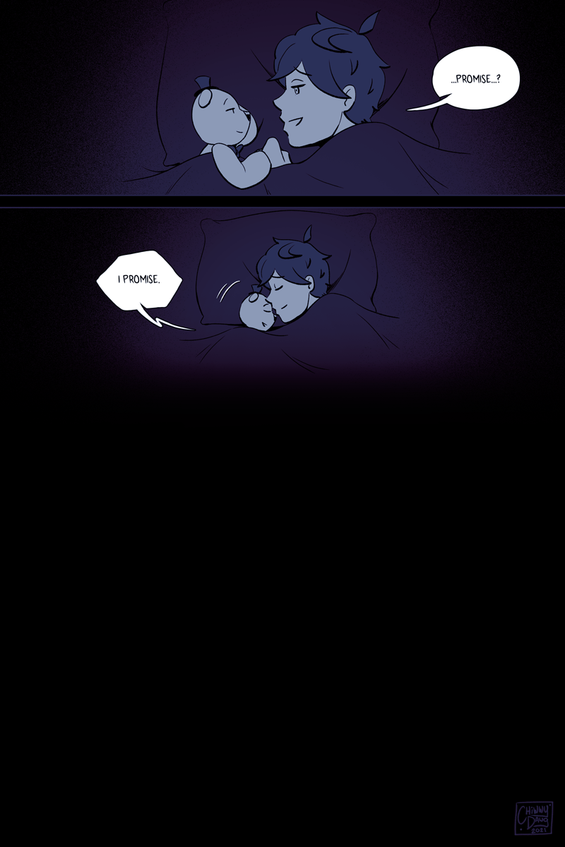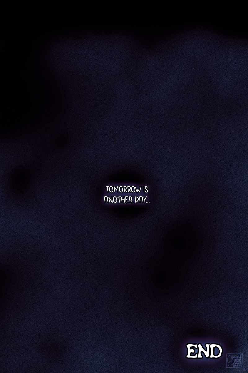 This is the single-most longest upload I've ever done. I debated on whether to split it up, but it felt pretty important to make sure that this sequence was read in a single sitting. I didn't feel like chopping it up, releasing it normally via two pages weekly (which would take five weeks, since this part consists of 10 pages,) and then stitching it back together again when it was completed. That method works fine for Webtoons and Tapas, but Deviantart is structured differently so I decided to just dump it all in one go.