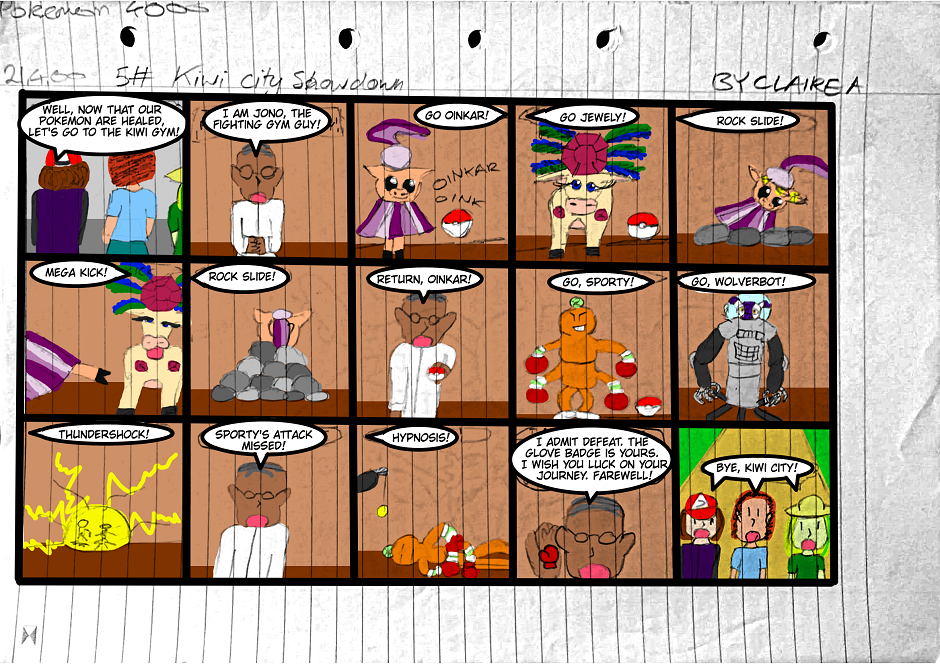 As part of the blog pokemontimecapsule.wordpress.com I am digitally colorizing and archiving the comic I wrote when I was ten years old. Claire Ketchum embarks on her Pokémon journey in the year 4000, a tradition which spans over two millenia following the likes of her ancestor Ash and his journey. In classic ten-year-old-kid writing style, you can expect a great deal of plagiarism from the Pokémon anime, nonsensical plot and character details, and a whole ton of imagination. There are over 100 pages of this comic and I intend to upload one episode per week until it's all done. I apologise for how bad it is! But you might find it interestingly-bad or funny-bad depending on your tastes.