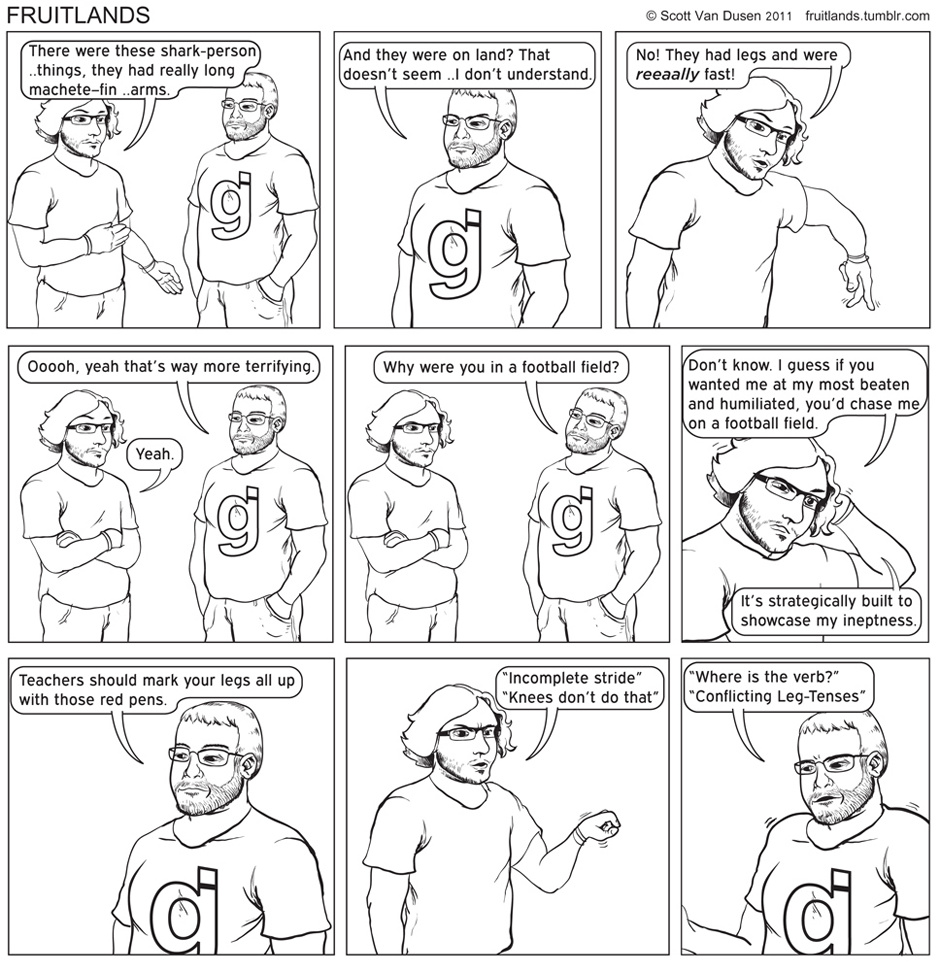 FruitLands is a web-comic about Gentlemen, Super-Heroes, Ladies, Sharks, Games, and brief uncomfortable embraces! ...and also some wrestling.