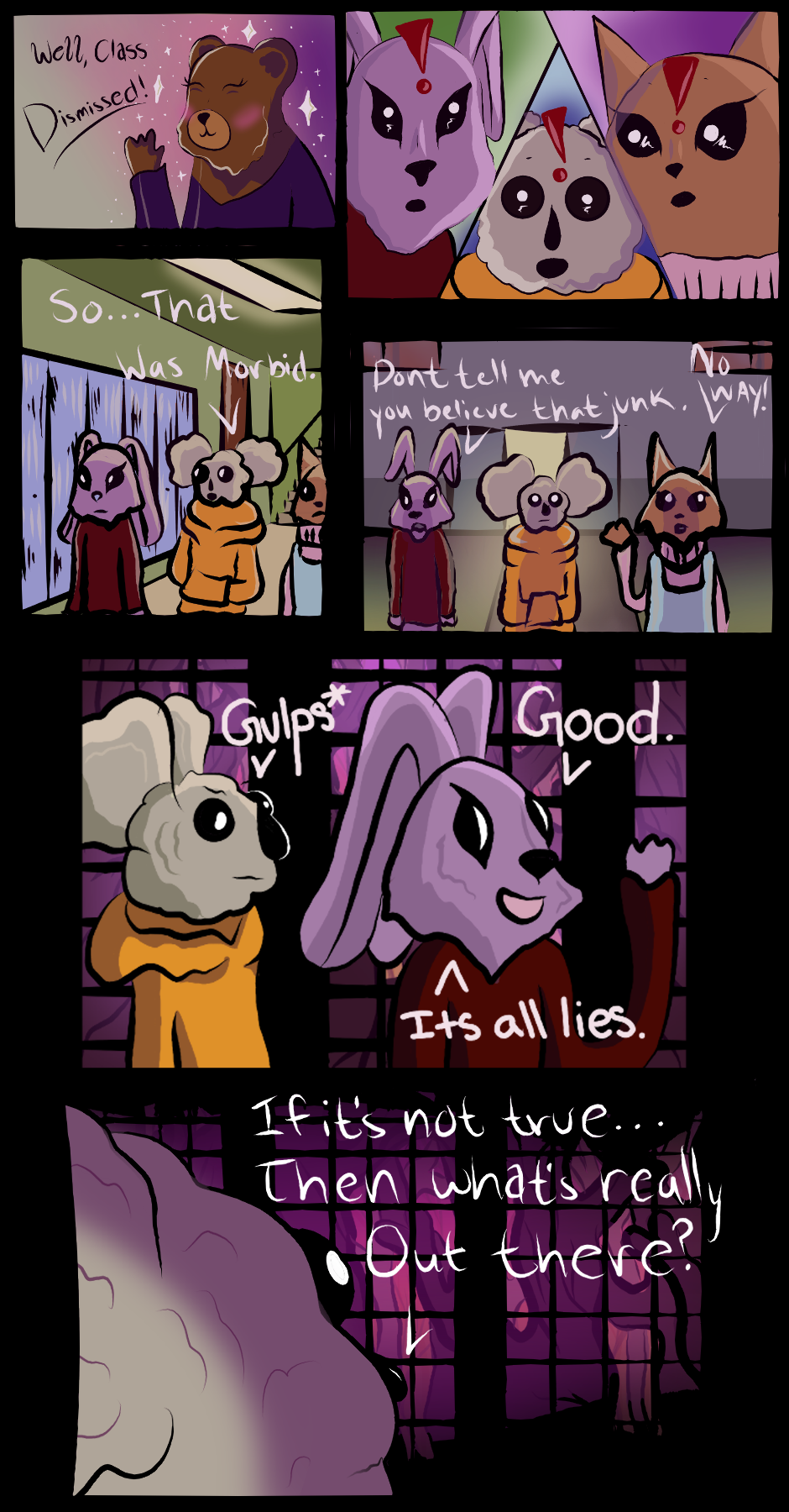 In this webcomic, Manny the koala, Juniper the rabbit, and Kat the... well... cat... venture out of their gated town into the surrounding forbidden forest. A place known for its treachery, the forest has a history of tales that all end in demise. But aside from the dark tales told about the forest, there is no tangible evidence demonstrating what goes on past the gates. In turn, there are more questions about the forest than answers;