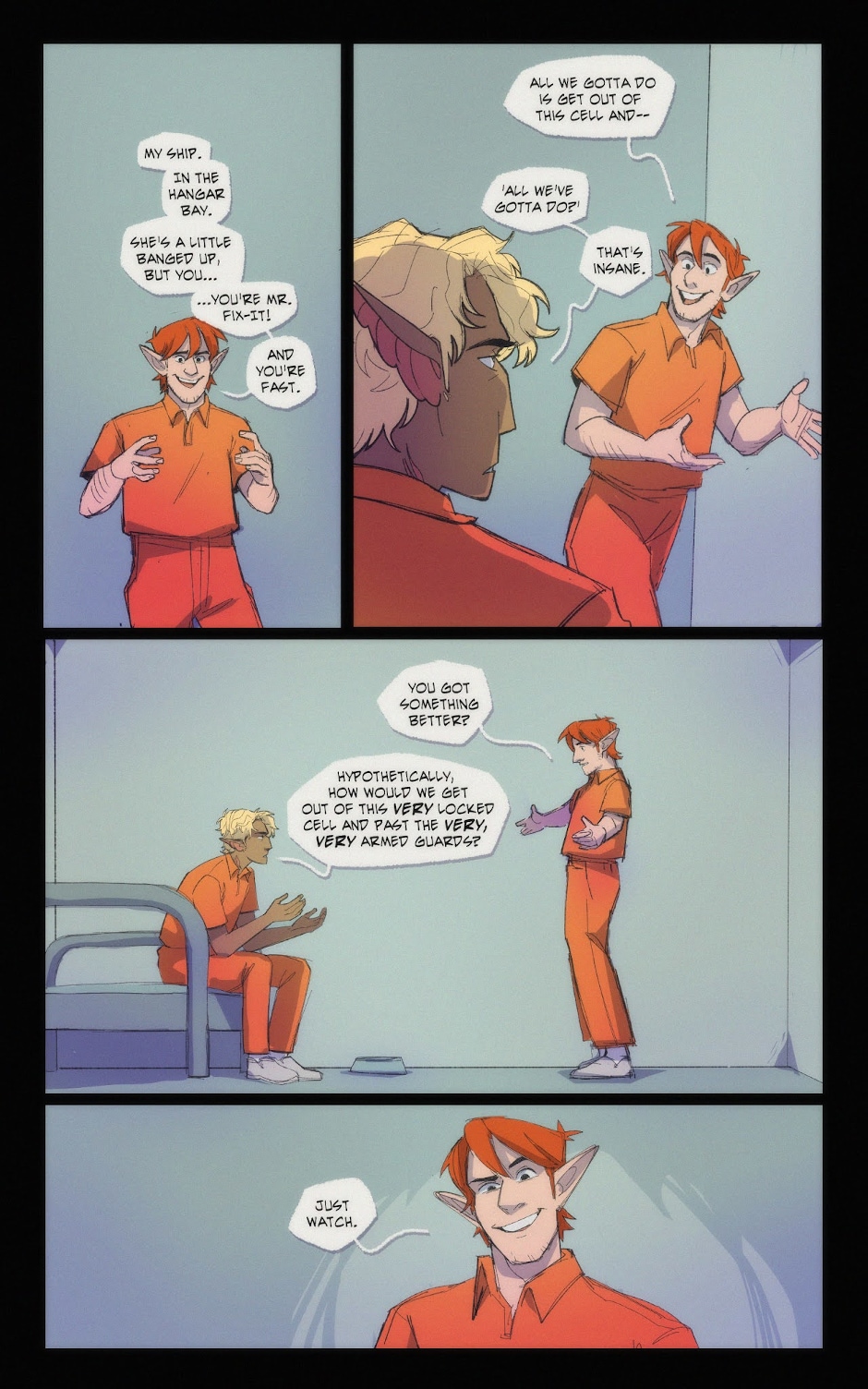 I was completely on team Kel through this whole exchange (me muttering "ALL we gotta do?? Um, hello, locked cells, armed guards??") ...until that look on Nick's face in the last panel 👀 I got shivers!!