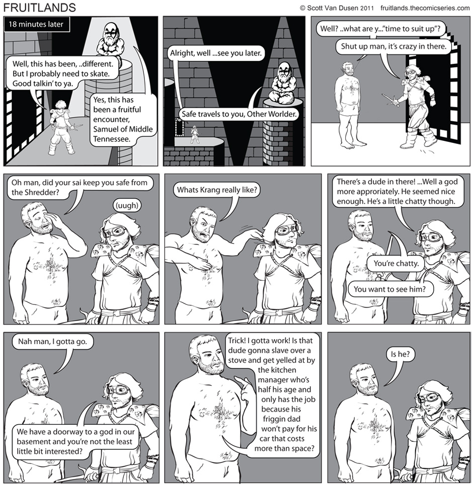 FruitLands is a web-comic about Gentlemen, Super-Heroes, Ladies, Sharks, Games, and brief uncomfortable embraces! ...and also some wrestling.