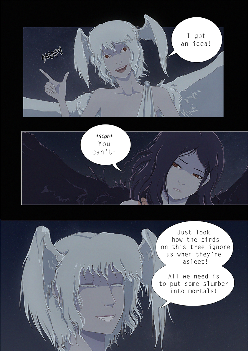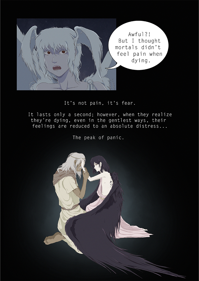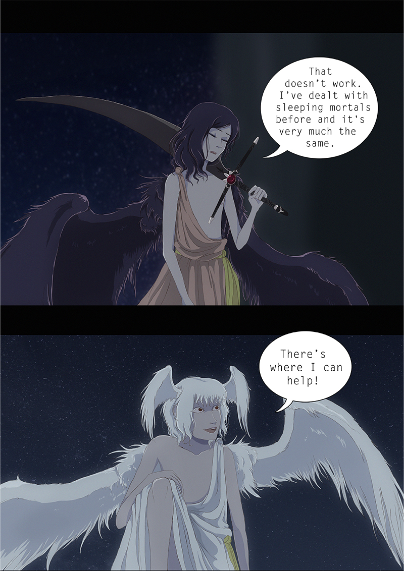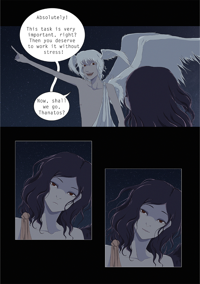 Hypnos and Thanatos share the same face, the same strength and a close bond in spite of their opposite personalities: While Sleep is gentle and embraced through his friendly nature, Death has grown cold and self-absorbed under the weight of his endless duty.