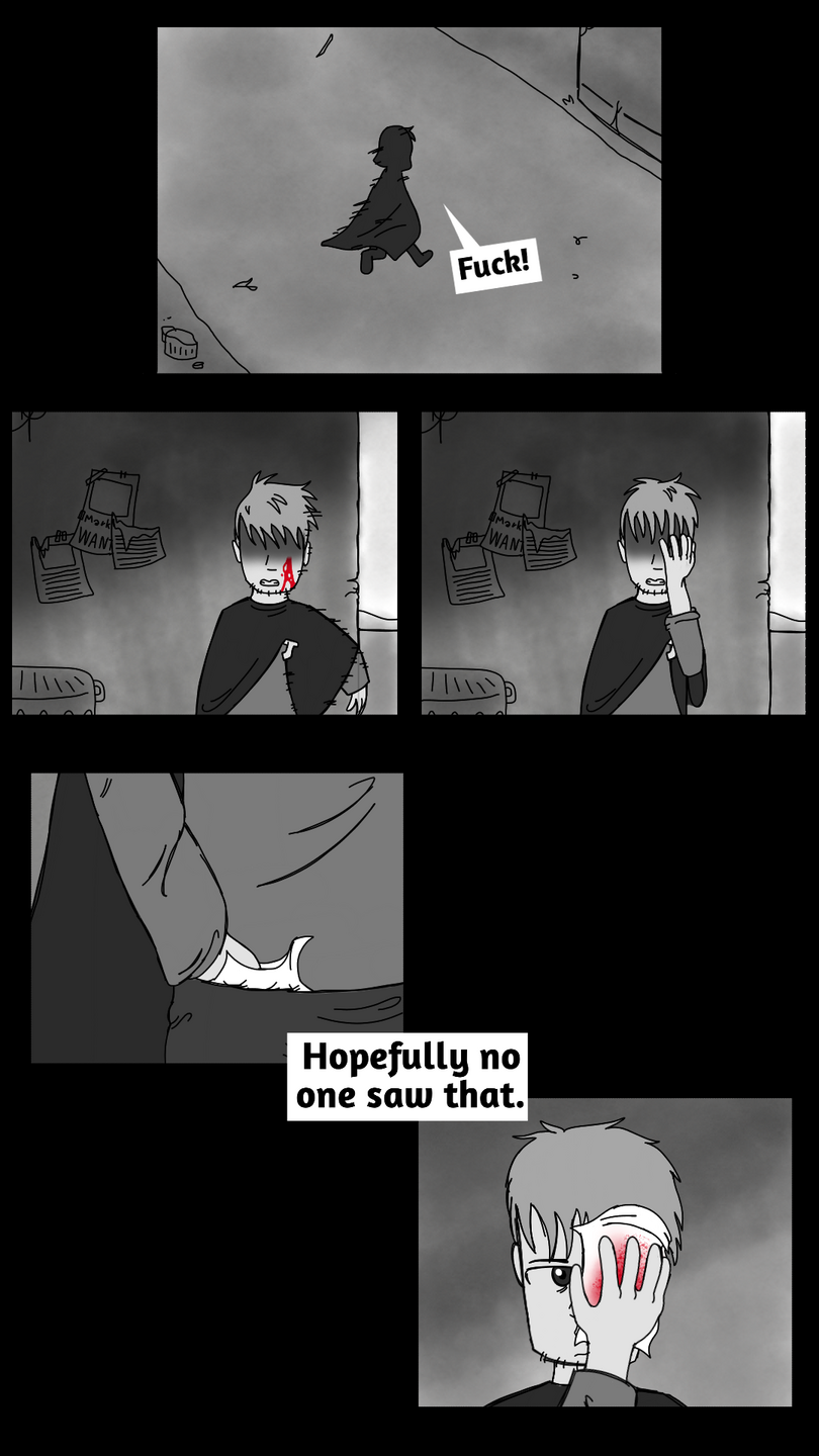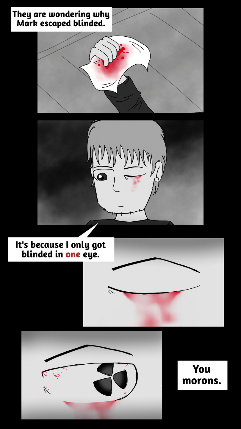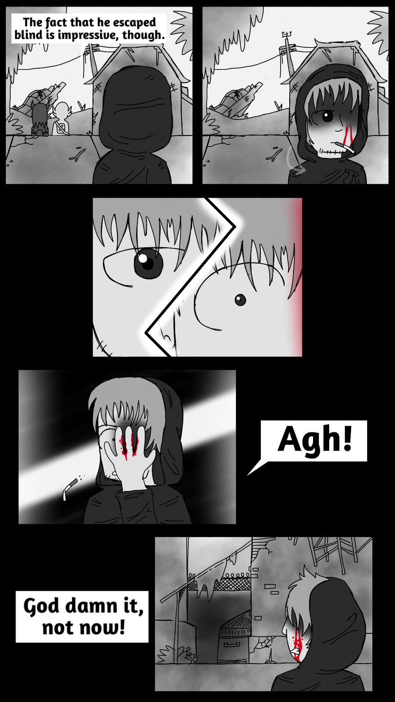 Cool nuclear eyeball! Loved the 'stretching ear' in panel where Axolotl man and the horned girl are talking about how he was blinded.