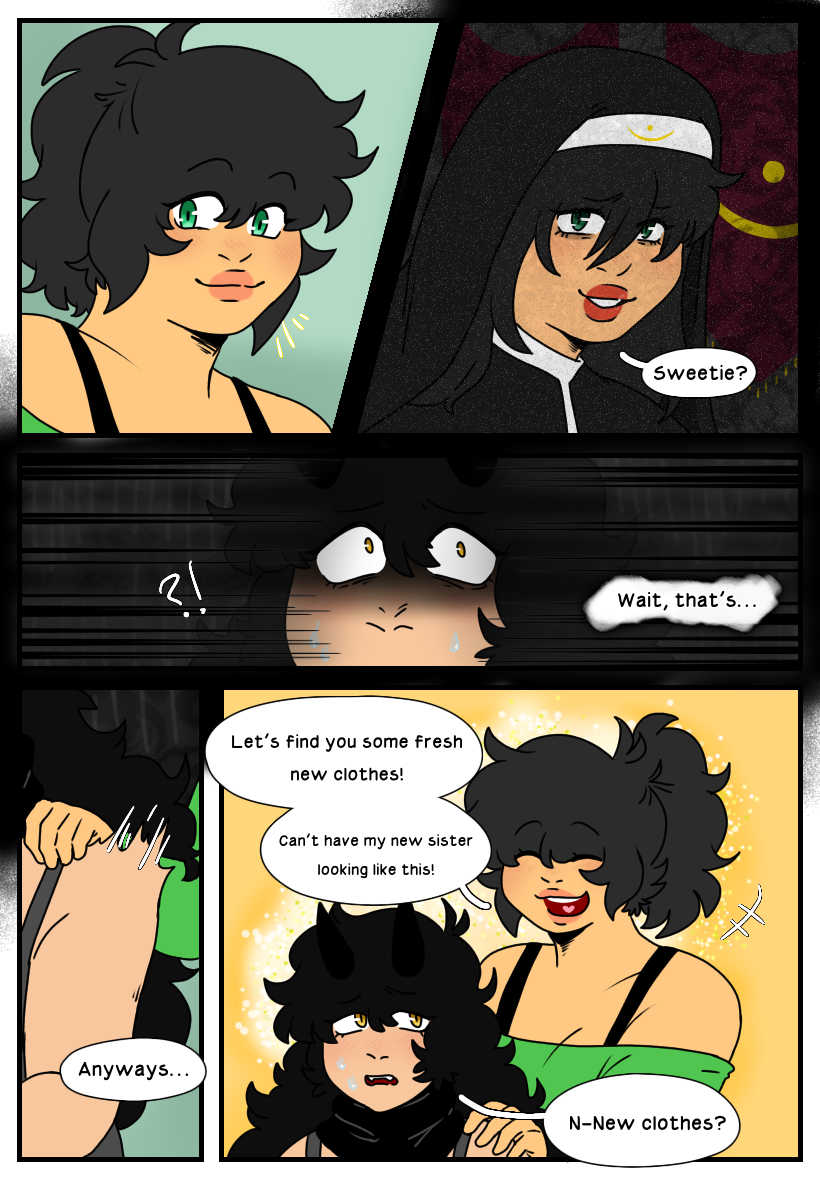 another update that took WAY TOO LONG im so sorry this is just a super quick two page update 🙏 lots of stuff happened, i had been working on the new pages but my old ipad got completely destroyed and i had to get a new one and ended up losing a bunch of the stuff i was working on in the process :( which means i have to remake a lot of pages i was already working on..but hopefully I’ll be able to get them done soon!! ^__^ anyways enjoy ocho and salt becoming sister besties for now