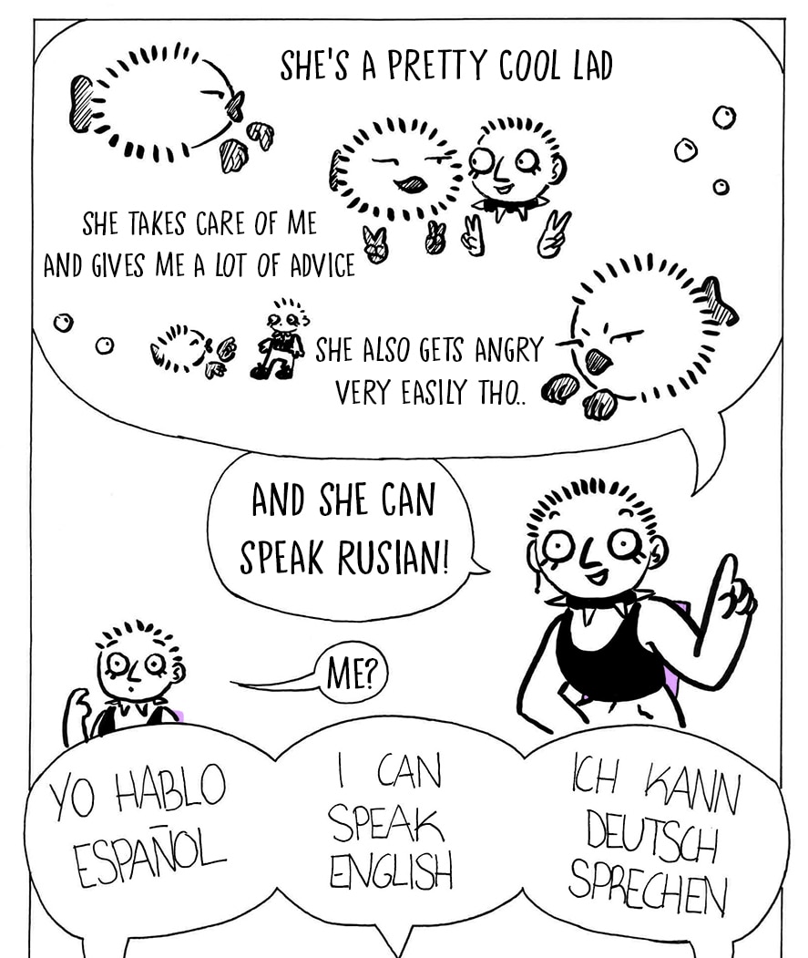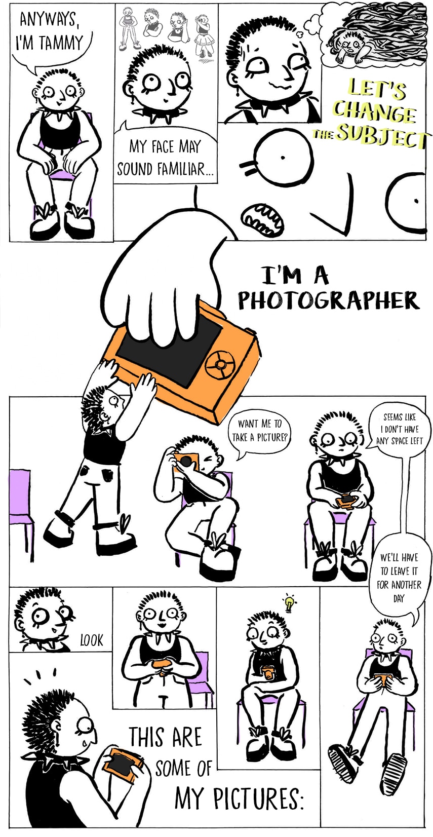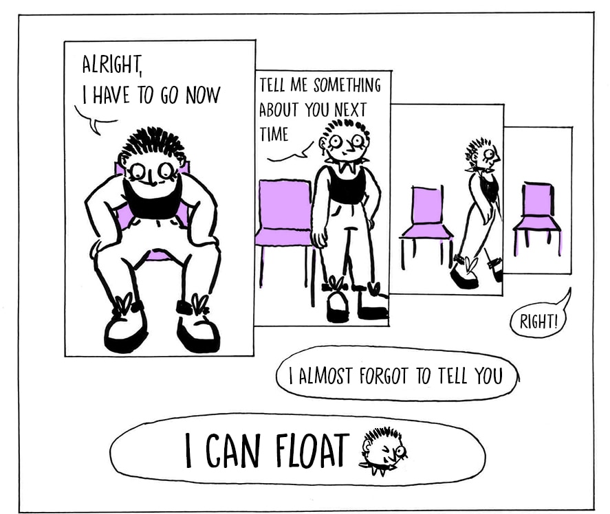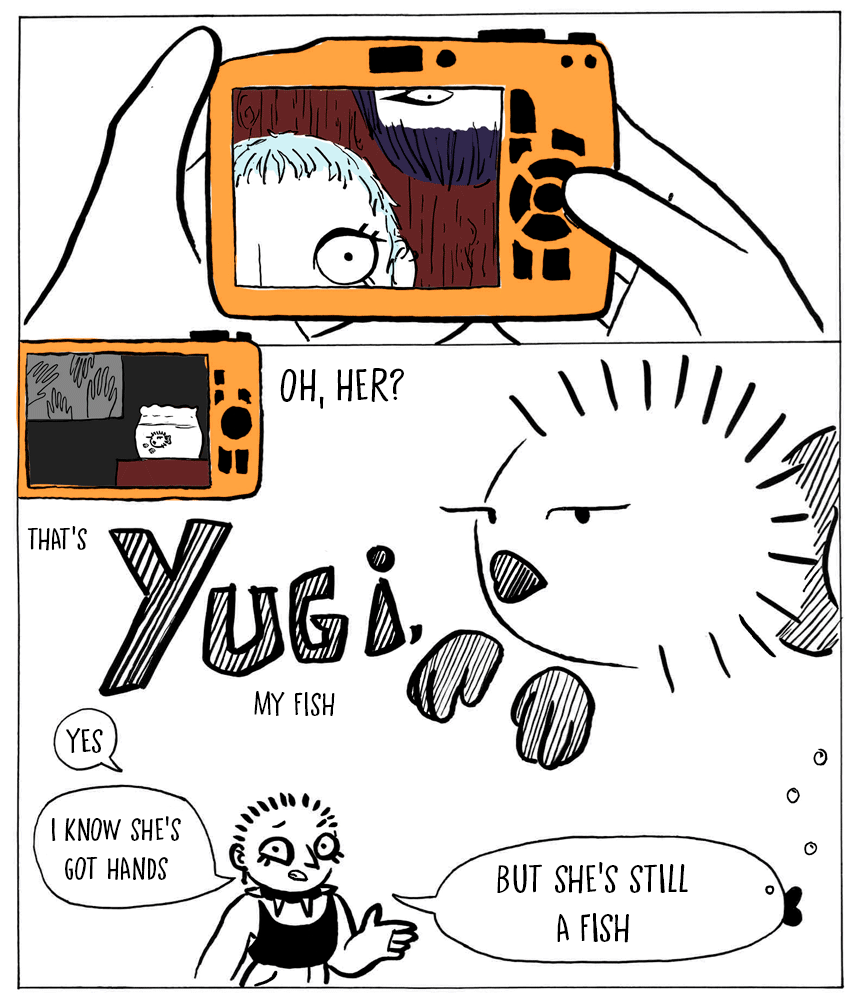 puta madre qué guapo jajajajaj el estilo de dibujo y sobre todo con las letras al final me recuerda a una serie de los 2010 que era una serie de personas reales pero la prota tenía como a su conciencia siendo un dibujo de una chica con camiseta rosa y rubia que parecía una medio barbie (no sé cómo se llama esa serie, pero el dibujo es como de adolescente que dibuja un personaje en su escritorio de clase). Y NO SABÍA QUE SE PODÍAN PONER GIFS, voy a preguntarte por whatsapp en algún momento cómo lo has hecho y cómo lo has publicado en tapas ok
