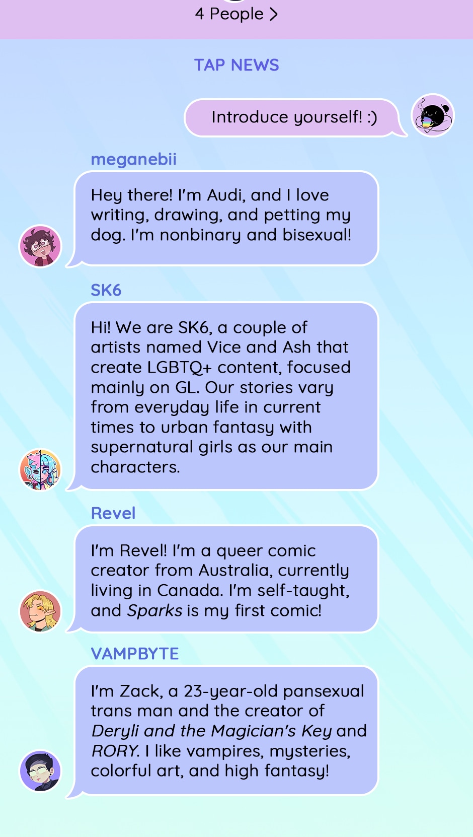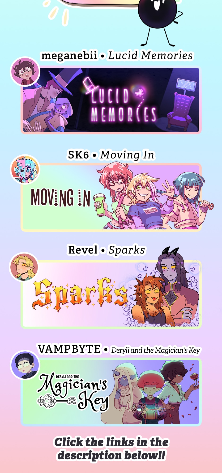 Lucid Memories: https://tapas.io/series/Lucid-Memories Moving In: https://tapas.io/series/Moving-in Sparks: https://tapas.io/series/Sparkscomic Deryli and the Magician's Key: https://tapas.io/series/deryli