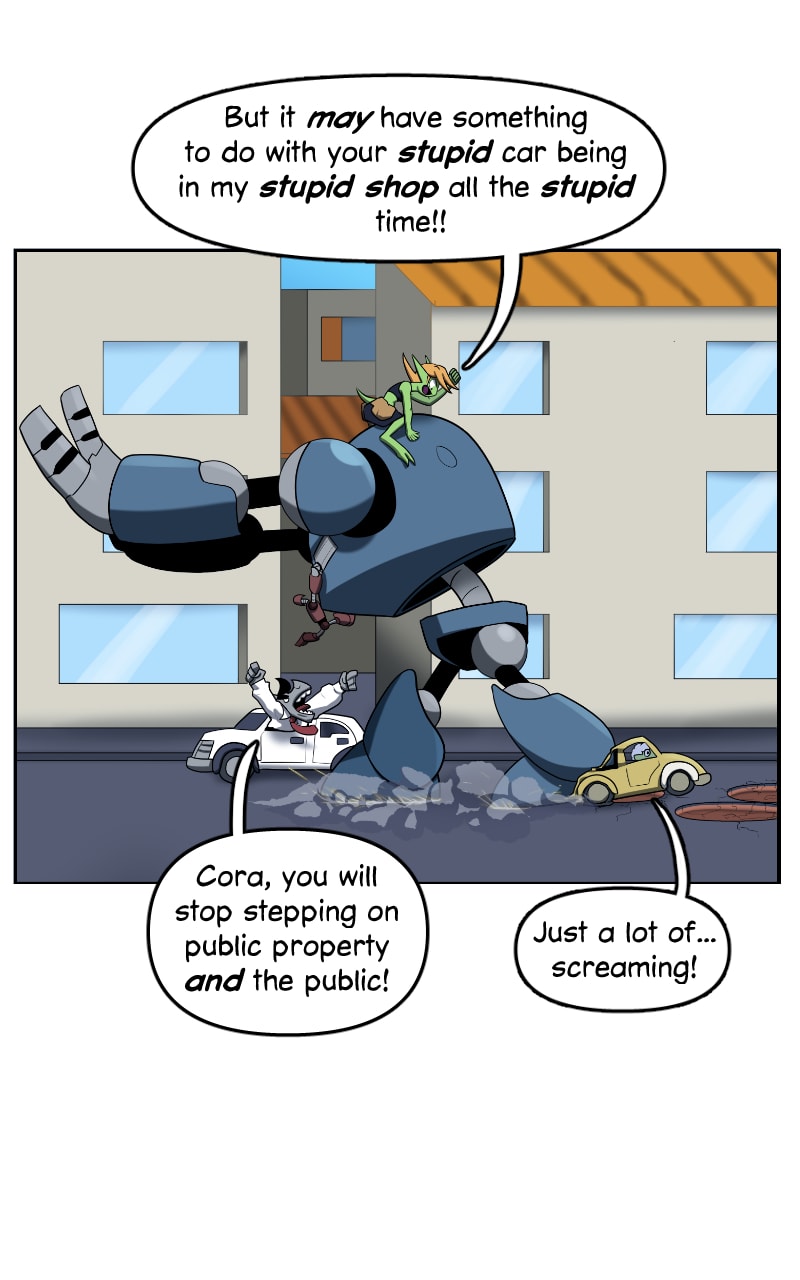Cora has stepped on the car of a customer. Is mecha based carnage covered under her shop's warranty?