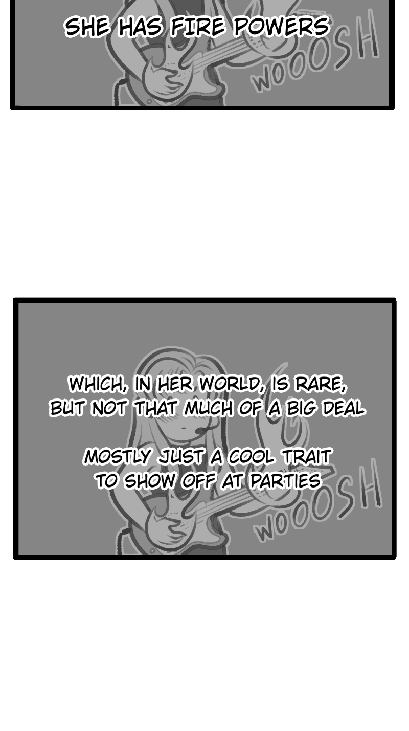 I hope this continues as a narrative device. Like fifty pages in and the comic stops to say, "oh, yeah, Violet is deathly afraid of caterpillars ever since this one class picnic in the second grade when she reached into her Mini Oreo bag and found a fuzzy caterpillar. Anyway, that's why she always looks inside her purse before reaching for her keys."