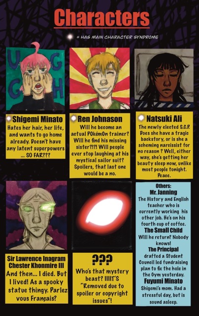 Shigemi Minato is completely and totally average. Yeah, right. But that’s what she wants to be. Despite being born with the rare condition Main Character Syndrome, she’s managed a fairly ordinary life. But all this, of course, is about to change. You wouldn’t be reading about her otherwise. From a nosy small child, to two other people like her, to a burnt out teacher, to the power of friendship, her life is about to take a change for the worst.