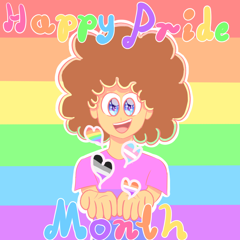 Hello! I have returned to say Happy Pride Month! I hope you like the art I made! The hands were a big struggle for me. In case it wasn't clear, I am bisexual, which I showed by drawing myself with the colours for the bisexual flag on the T-shirt. I want to let everyone in the community know that you have my full support! Have an excellent pride month, everyone!
