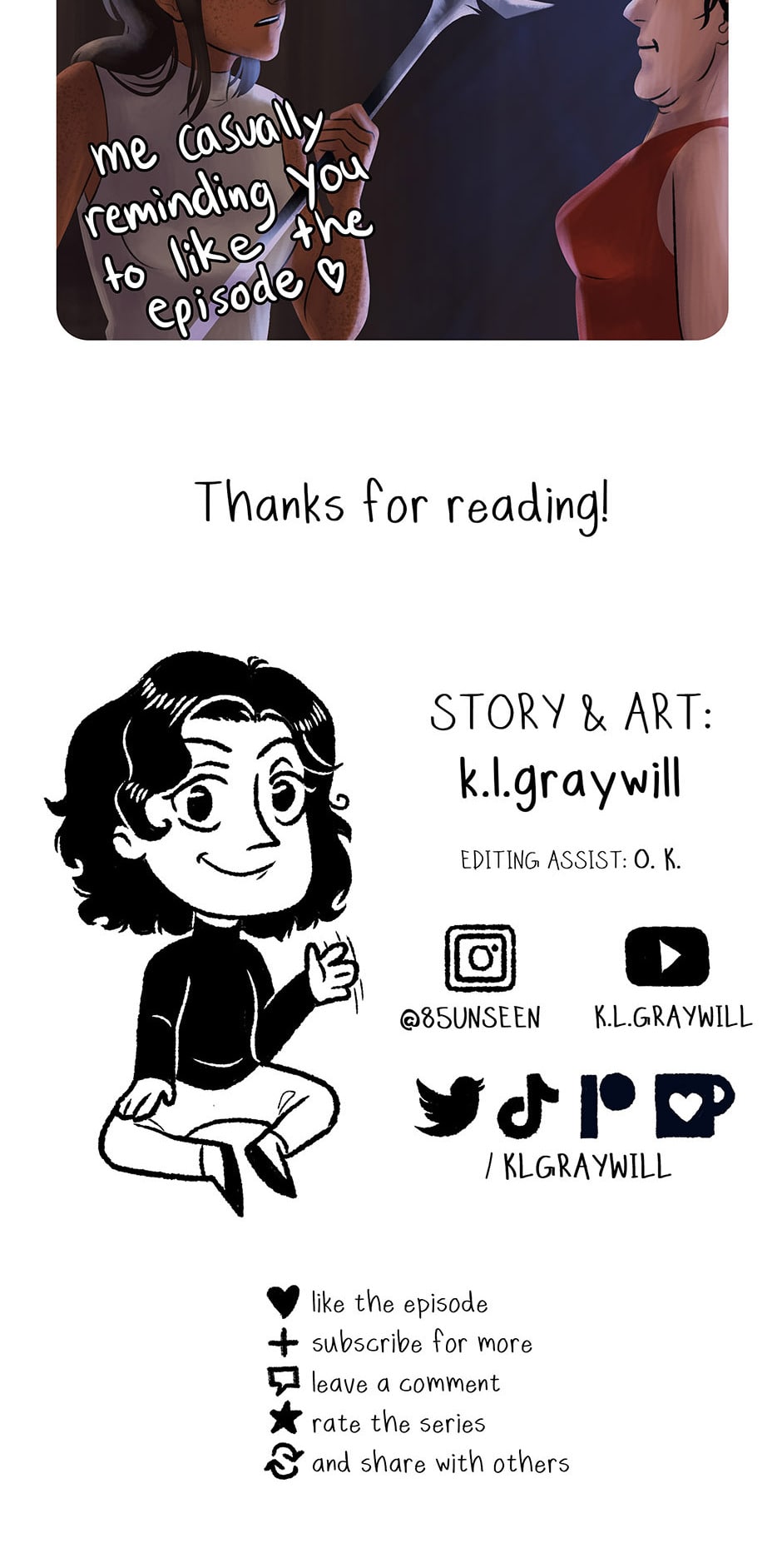 Follow this adventure filled with mystery, action, and drama every week and on social media at: IG @graywillcomics // YT @k.l.graywill // TT @klgraywill --ON HIATUS TIL OCTOBER--