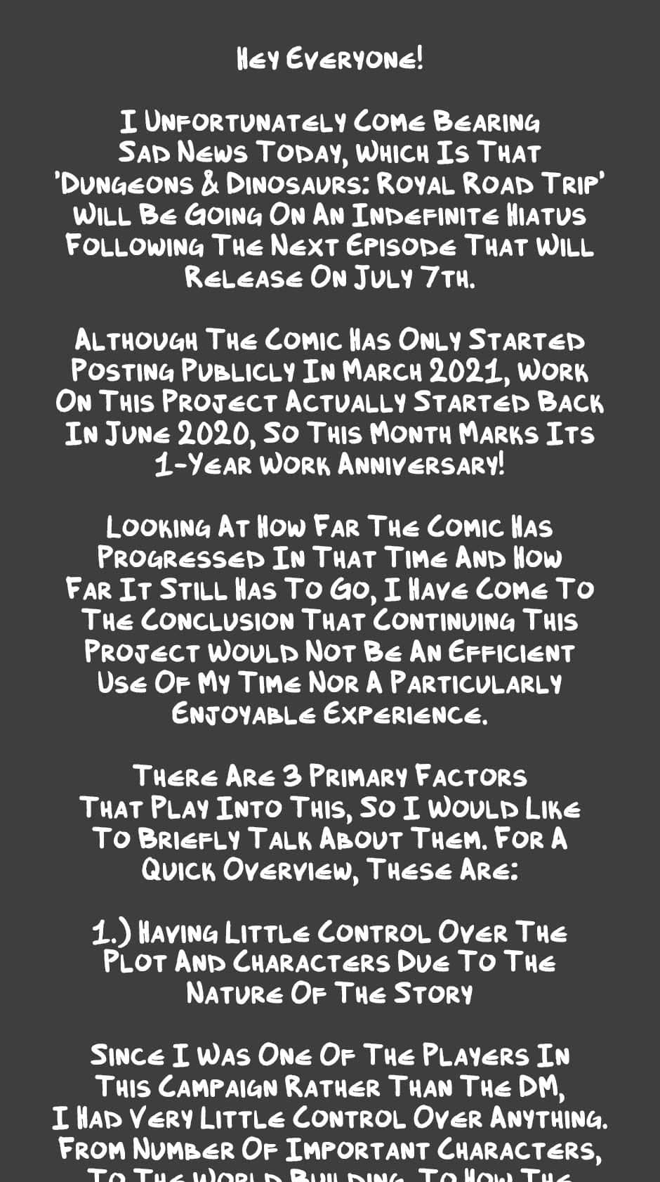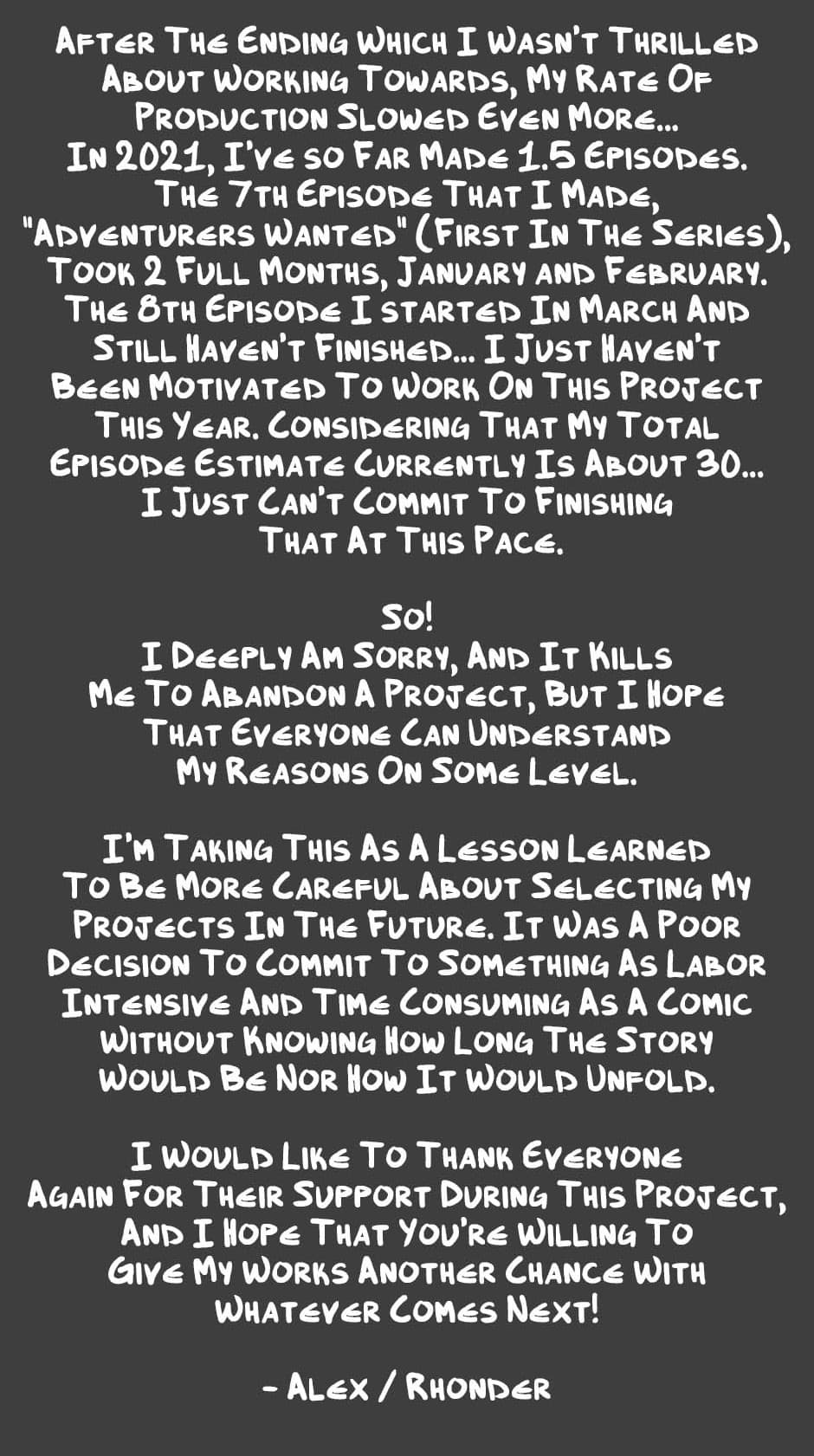 Apologies to everyone who was looking forward to seeing more from this project! I do hope that I'm able to make up for it with whatever comes next :) A short story idea or two are in the works presently, so I'm hoping to be able to share more later this year. And as mentioned in the first paragraph of the post, there will be 1 more episode releasing for this series in a few weeks!