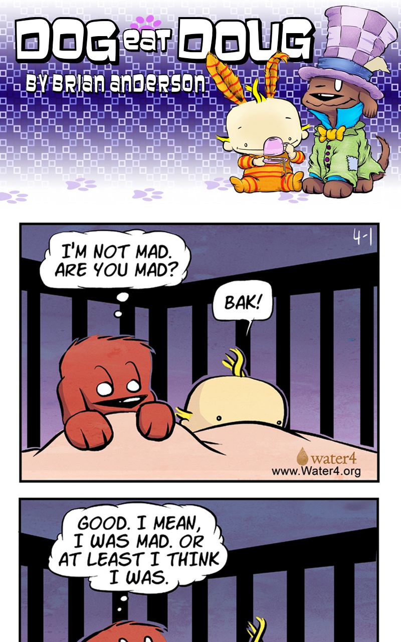 Dog eat Doug follows the daily exploits of Sophie, a cheese-loving chocolate Lab with a nose for the nuances of sarcasm and irony, and baby Doug, a healthy, happy newborn with no concept of jealousy and a limitless curiosity. Along with steampunk cats, comedy club squirrels and a steady stream of quirky foster dogs.