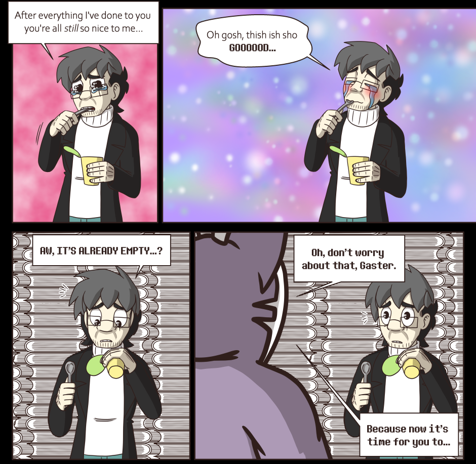 Sans finds Gaster's old journal in the True Lab and starts to read about his science misadventures. It turns out that the royal scientist was a caffeine-addicted manchild who stumbled from one explosive accident to the next. In the midst of that chaos, a mutagen was developed that can turn monsters into humans.