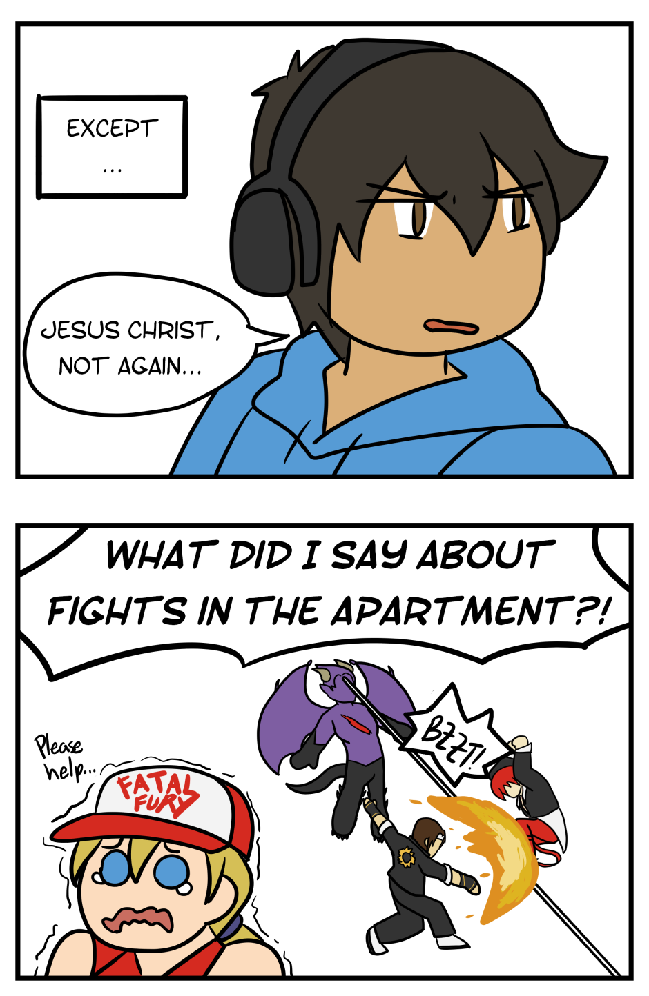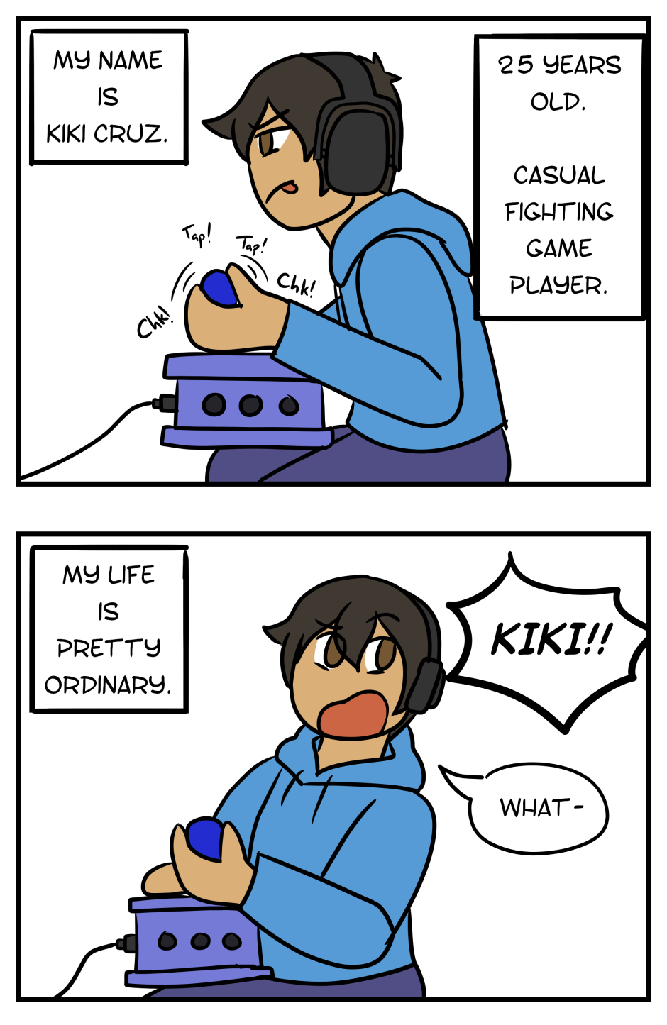 One stormy evening, Kiki Cruz's life gets flipped upside-down after a power surge causes her favorite characters from The King of Fighters and Tekken to jump out of her PC and into the 3D world. With no way to return them to their 2D home, Kiki has no choice but to let Kyo Kusanagi, Iori Yagami, Terry Bogard, and Kazuya Mishima become her new roommates.