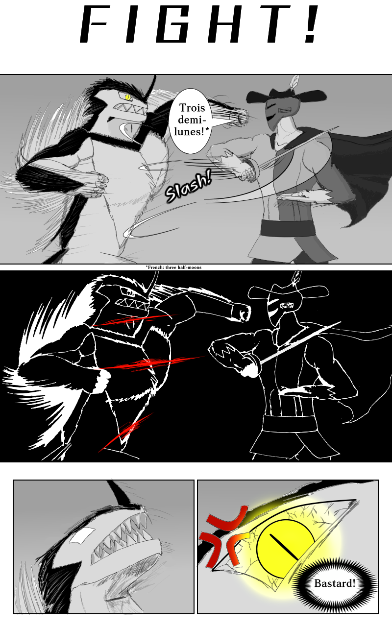 And on the right corner, we got a giant human (?), wearing a Three Musketeers cheap cosplay, hiding his face under an iron mask and wielding a big sword. The unknown challenger, MASKED IRON!!!