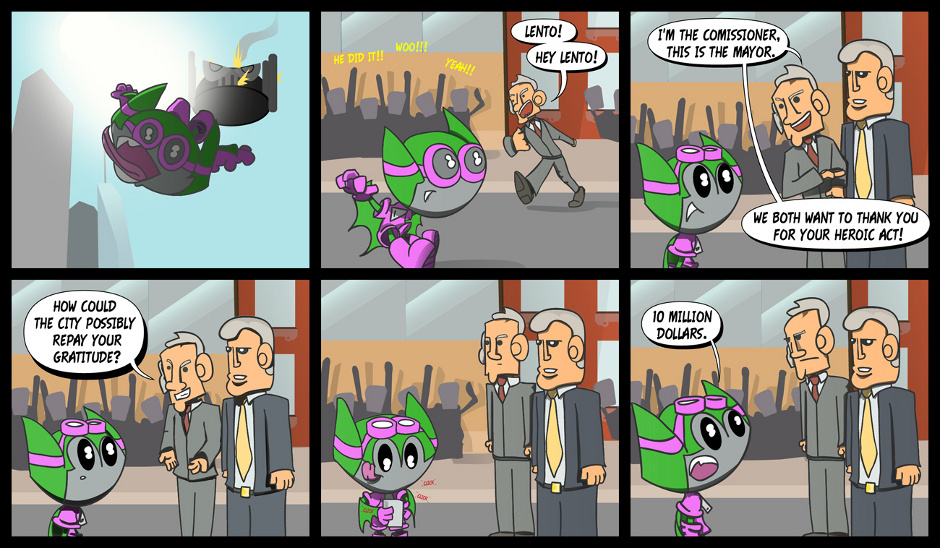 Lento, a savvy, anthropomorphic superhero slabbed in the progressive culture of the "big city". Lento fights off the evils of Dr. Mask while learning to swerve around the current trends and fads of the 21st century in this satirical comedy/superhero webcomic.